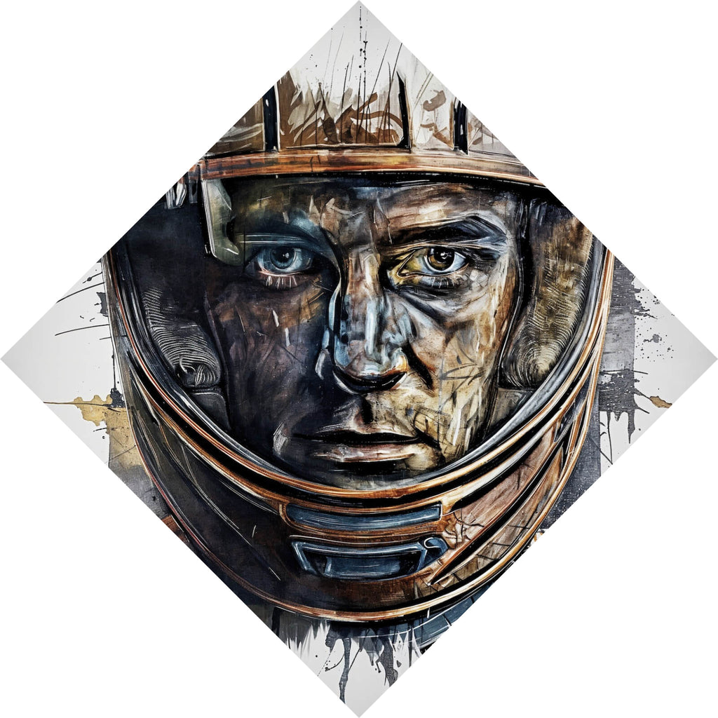 Dieses beeindruckende Wandbild zeigt ein modernes abstraktes Porträt eines Menschen mit einem Helm, das durch seine dynamische und ausdrucksstarke Darstellung besticht. Der Fokus liegt auf dem Gesicht, das mit intensiven Details und einer ausgeprägten Struktur die Aufmerksamkeit des Betrachters fesselt. Der Helm, der das Gesicht umrahmt, verleiht dem Bild eine sportliche und technische Note, die perfekt in moderne Wohnräume oder Arbeitsumgebungen passt. Das Bild ist in einem zeitgemäßen Stil gehalten, der durch seine kreative Komposition und die präzise Technik besticht. Die Darstellung schafft eine spannende Spannung zwischen Abstraktion und Realität, indem sie die Persönlichkeit und den Ausdruck der dargestellten Person hervorhebt. Die Tiefe und der Fokus des Bildes erzeugen eine starke Raumwirkung, die dem Raum, in dem es platziert wird, eine besondere Atmosphäre verleiht. Dieses Kunstwerk ist ideal für Liebhaber von moderner und abstrakter Kunst, die Wert auf Ausdruck und Intensität legen. Die Kombination aus künstlerischem Design und technischer Präzision macht es zu einem faszinierenden Blickfang, der sowohl in privaten als auch in professionellen Umgebungen für Gesprächsstoff sorgt.