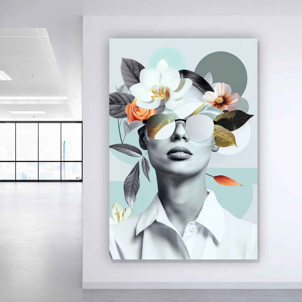 Dieses beeindruckende Wandbild zeigt ein modernes Portrait einer Frau, deren Gesicht harmonisch mit einem kunstvollen Blumenarrangement kombiniert ist. Die Komposition verbindet zeitgenössische Kunststile mit klassischen Elementen und strahlt eine Aura von Eleganz und Kreativität aus. Die subtilen Formen der Blüten und Blätter fügen eine natürliche Note hinzu, die im Kontrast zu den klaren Linien des Gesichtes steht. Die Darstellung vermittelt eine tiefgreifende Ausdruckskraft und inspiriert durch ihre innovative Gestaltung. Das Bild eignet sich ideal für moderne Wohnräume oder Büros, da es eine Atmosphäre der Ruhe und Ästhetik schafft. Die künstlerische Kombination von Formen und Motiven lädt Betrachter ein, in die Tiefe des Bildes einzutauchen und sich von der Balance zwischen Natur und moderner Kunst inspirieren zu lassen. Die feine Materialanmutung verstärkt den hochwertigen Eindruck des Wandbildes und macht es zu einem zentralen Blickfang in jedem Raum. Dank seines zeitlosen Designs passt es sich leicht verschiedenen Einrichtungsstilen an und verleiht jedem Raum eine besondere Note von Stil und Raffinesse.