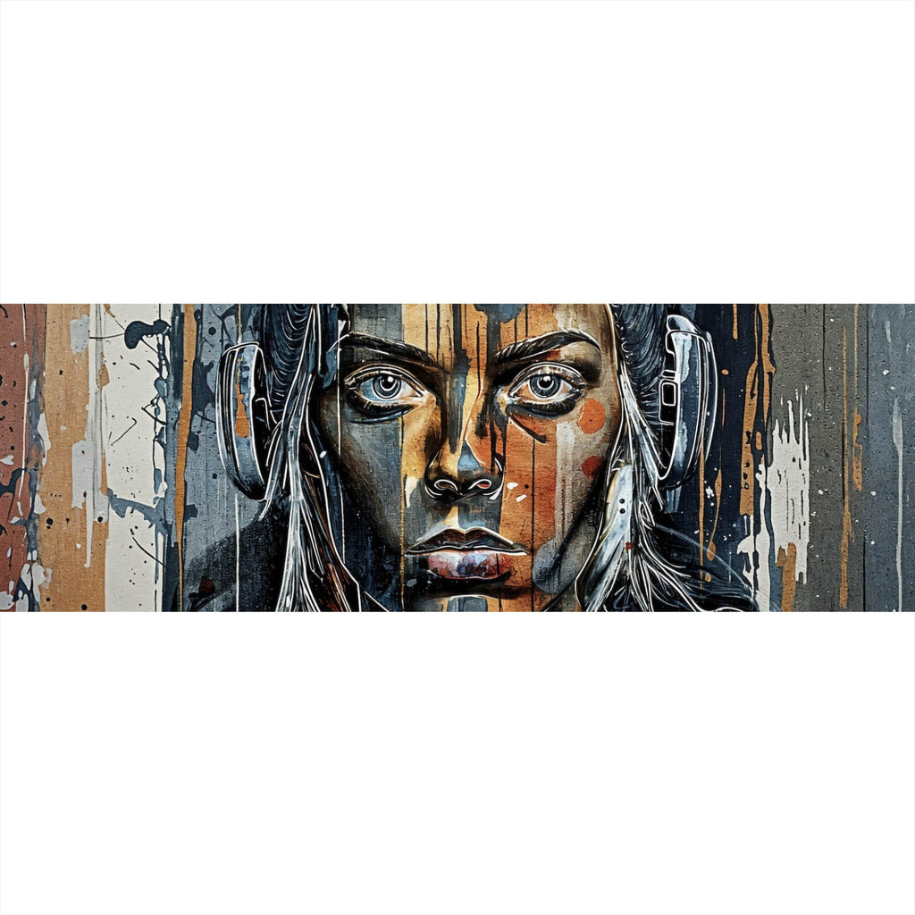 Diese beeindruckende Wandbild zeigt ein modernes, abstraktes Porträt einer Person mit Kopfhörern, das durch einen urbanen und zeitgenössischen Stil besticht. Die detaillierte Darstellung des Gesichts kombiniert mit den fließenden Linien und Tropfen, die sich über die gesamte Leinwand erstrecken, erzeugt eine dynamische und ausdrucksstarke Wirkung. Die Mischung aus verschiedenen Texturen und Stilen verleiht dem Bild eine besondere Tiefe und eine faszinierende Materialanmutung. Die Komposition wirkt sowohl kraftvoll als auch beruhigend und eignet sich ideal für moderne Wohnräume oder Büros, die eine kreative und stilvolle Atmosphäre fördern möchten. Das Bild zieht die Blicke auf sich und lädt den Betrachter ein, die Details und den Ausdruck des Porträts näher zu erkunden. Die künstlerische Kombination von Formen und Linien schafft ein einzigartiges visuelles Erlebnis, das perfekt in urbane und moderne Einrichtungskonzepte passt. Dieses Kunstwerk ist mehr als nur Dekoration; es ist ein Statement, das Individualität und kreativen Ausdruck in jedem Raum unterstreicht.