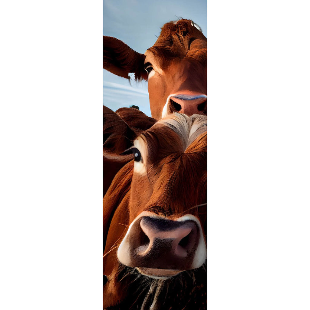 Das Bild zeigt eine eindrucksvolle Nahaufnahme von neugierigen Kühen, die die Betrachter direkt anzuschauen scheinen. Diese Darstellung von Tieren in ihrer natürlichen Umgebung vermittelt ein Gefühl von Ruhe und Gelassenheit und ist ideal für Liebhaber von Naturmotiven. Die Kühe sind detailreich abgebildet und strahlen eine rustikale und gemütliche Atmosphäre aus, die perfekt in ein modernes oder ländlich inspiriertes Interieur passt. Die Komposition der Köpfe und Schnauzen, die fast den gesamten Bildraum einnehmen, zieht die Aufmerksamkeit auf sich und schafft eine tiefe Verbindung zwischen Bild und Betrachter. Die harmonische Anordnung der Tiere und der klare Fokus auf ihre Gesichtszüge verleihen dem Bild eine lebendige und zugleich beruhigende Wirkung. Diese Wanddekoration eignet sich hervorragend für Wohnräume, die eine entspannende und einladende Atmosphäre ausstrahlen sollen, sei es im Wohnzimmer, Esszimmer oder Büro. Die Bildwirkung ist kraftvoll und doch subtil, was es zu einer vielseitigen Ergänzung für verschiedene Raumkonzepte macht. Die präzise Detailarbeit und die natürliche Anmutung des Motivs machen dieses Wandbild zu einem idealen Accessoire für Liebhaber von Tierfotografie und modernem Design.
