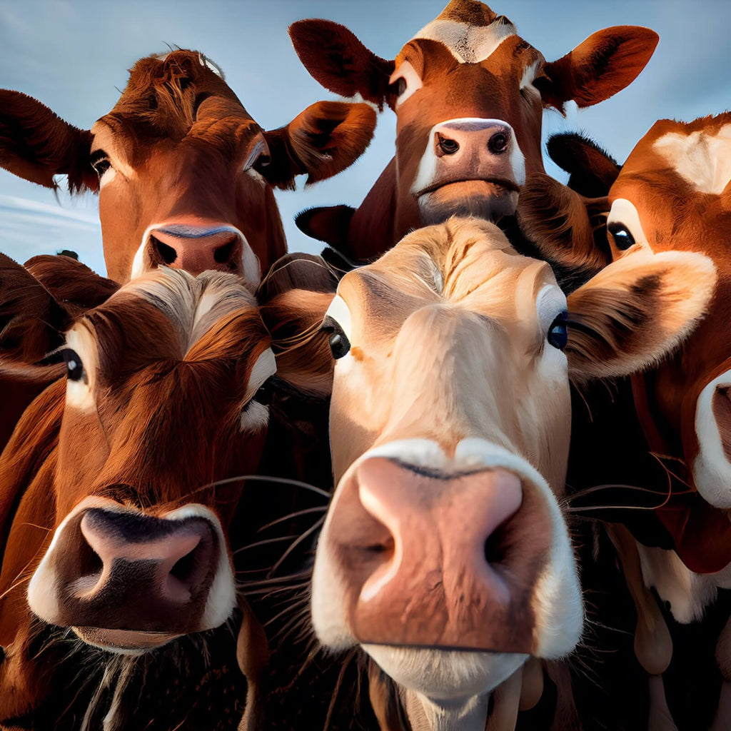 Das Bild zeigt eine eindrucksvolle Nahaufnahme von neugierigen Kühen, die die Betrachter direkt anzuschauen scheinen. Diese Darstellung von Tieren in ihrer natürlichen Umgebung vermittelt ein Gefühl von Ruhe und Gelassenheit und ist ideal für Liebhaber von Naturmotiven. Die Kühe sind detailreich abgebildet und strahlen eine rustikale und gemütliche Atmosphäre aus, die perfekt in ein modernes oder ländlich inspiriertes Interieur passt. Die Komposition der Köpfe und Schnauzen, die fast den gesamten Bildraum einnehmen, zieht die Aufmerksamkeit auf sich und schafft eine tiefe Verbindung zwischen Bild und Betrachter. Die harmonische Anordnung der Tiere und der klare Fokus auf ihre Gesichtszüge verleihen dem Bild eine lebendige und zugleich beruhigende Wirkung. Diese Wanddekoration eignet sich hervorragend für Wohnräume, die eine entspannende und einladende Atmosphäre ausstrahlen sollen, sei es im Wohnzimmer, Esszimmer oder Büro. Die Bildwirkung ist kraftvoll und doch subtil, was es zu einer vielseitigen Ergänzung für verschiedene Raumkonzepte macht. Die präzise Detailarbeit und die natürliche Anmutung des Motivs machen dieses Wandbild zu einem idealen Accessoire für Liebhaber von Tierfotografie und modernem Design.