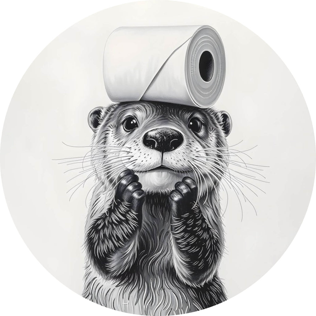 Auf dem Bild ist eine bezaubernde Zeichnung eines Otters zu sehen, der auf humorvolle Weise eine Rolle Toilettenpapier auf dem Kopf balanciert. Der Otter ist in einem monochromen Schwarz-Weiß-Stil illustriert, was der Darstellung einen klassischen und stilvollen Look verleiht. Seine großen, neugierigen Augen und die leicht hochgezogenen Pfoten lassen ihn besonders niedlich und verspielt erscheinen. Die Details in seinem Fell sind sorgfältig ausgearbeitet, wodurch der Otter lebendig und realistisch wirkt. Das Toilettenpapier, das untypisch auf dem Kopf des Tieres platziert ist, fügt dem Bild eine humorvolle Note hinzu, die den Betrachter zum Schmunzeln bringt. Die gesamte Komposition ist minimalistisch gehalten, mit einem glatten, hellen Hintergrund, der den Fokus vollständig auf den charmanten Otter lenkt. Diese Illustration eignet sich hervorragend als dekoratives Element in einem modernen Raum oder als Teil einer humorvollen Kunstsammlung. Sie spricht Tierliebhaber und Kunstfreunde gleichermaßen an und vermittelt eine fröhliche, unbeschwerte Stimmung.