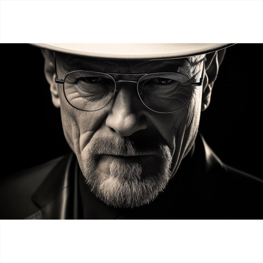 Das Bild zeigt ein eindrucksvolles Porträt eines Mannes mit markanten Gesichtszügen, der einen eleganten Hut und eine Brille trägt. Die Darstellung ist in einem modernen und stilvollen Kunststil gehalten, der dem Bild eine zeitlose Eleganz und Tiefe verleiht. Die feinen Details im Gesicht und der Ausdruck des Mannes vermitteln eine starke Präsenz und Charisma, was das Bild zu einem Blickfang in jedem Raum macht. Die klaren Konturen und der Fokus auf die Gesichtszüge erzeugen eine faszinierende Atmosphäre, die sowohl Ruhe als auch Intensität ausstrahlt. Dieses Wandbild eignet sich ideal zur Dekoration von Räumen, die eine besondere Note und Ausdrucksstärke benötigen. Es fügt sich harmonisch in moderne Einrichtungskonzepte ein und kann als stilvolles Element in Büros, Wohnzimmern oder Bars dienen. Die Komposition lenkt den Blick des Betrachters sofort auf die zentralen Details und schafft einen eindrucksvollen visuellen Effekt, der lange im Gedächtnis bleibt.