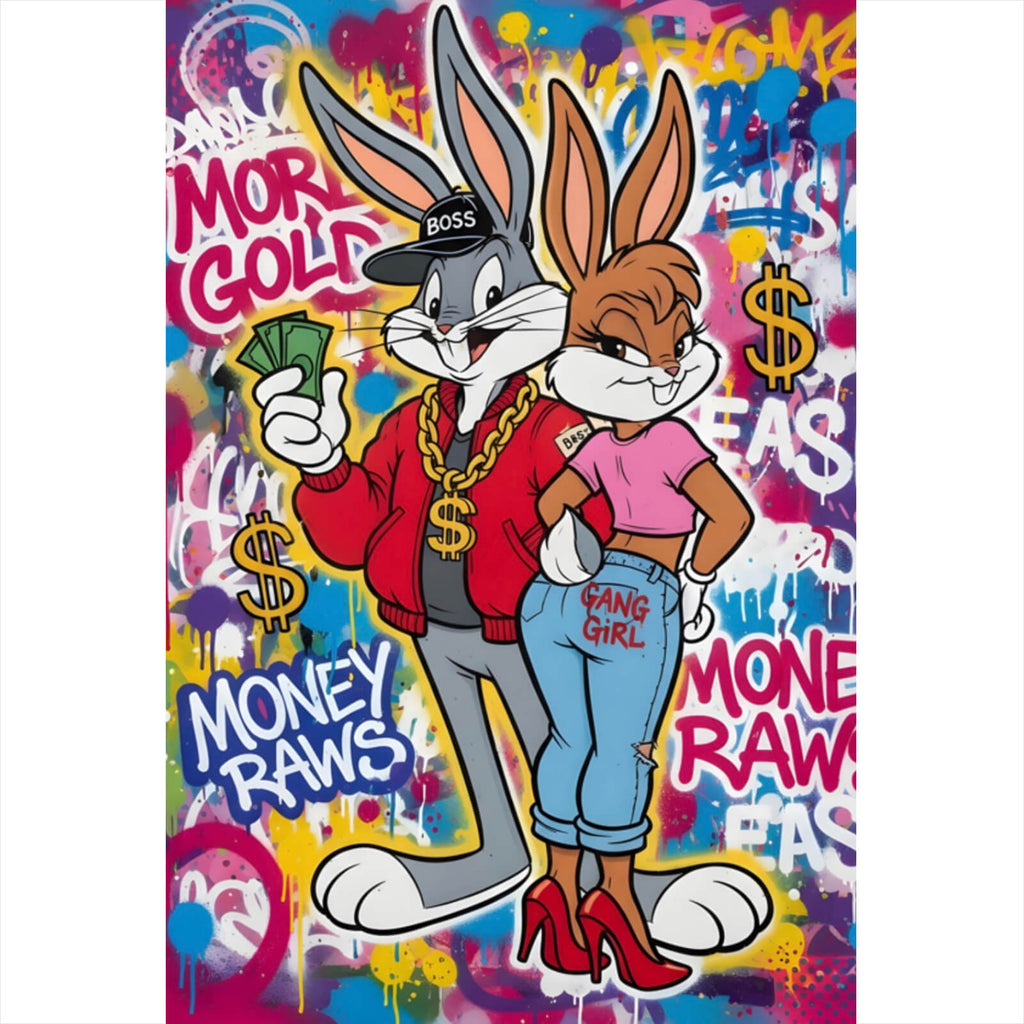 Dieses beeindruckende Wandbild kombiniert die Lebendigkeit von Graffiti mit der Verspieltheit von Cartoons und schafft so ein dynamisches Kunstwerk, das sowohl moderne als auch popkulturelle Elemente vereint. Die Figuren sind in einem urbanen Stil gehalten, der durch den starken Einsatz von Text und Symbolik ergänzt wird, was das Thema Geld und Luxus hervorhebt. Die ausgeprägte Materialanmutung des Sprühens verleiht dem Bild eine texturierte Tiefe, die in jedem Raum eine lebendige Atmosphäre schafft. Das Motiv zeigt zwei Cartoon-Charaktere, die durch ihre Haltung und Accessoires einen luxuriösen Lebensstil verkörpern. Diese stilvolle und kreative Darstellung zieht sofort die Aufmerksamkeit auf sich und dient als perfekter Blickfang in modernen Wohn- oder Arbeitsbereichen. Der Gesamteindruck ist kraftvoll und ausdrucksstark, was es zu einem idealen Statement-Stück für alle macht, die ihrer Umgebung einen Hauch von urbaner Coolness verleihen möchten. Durch die Mischung aus Humor und Gesellschaftskritik entsteht ein einzigartiges Kunstwerk, das sowohl zum Nachdenken anregt als auch unterhält.