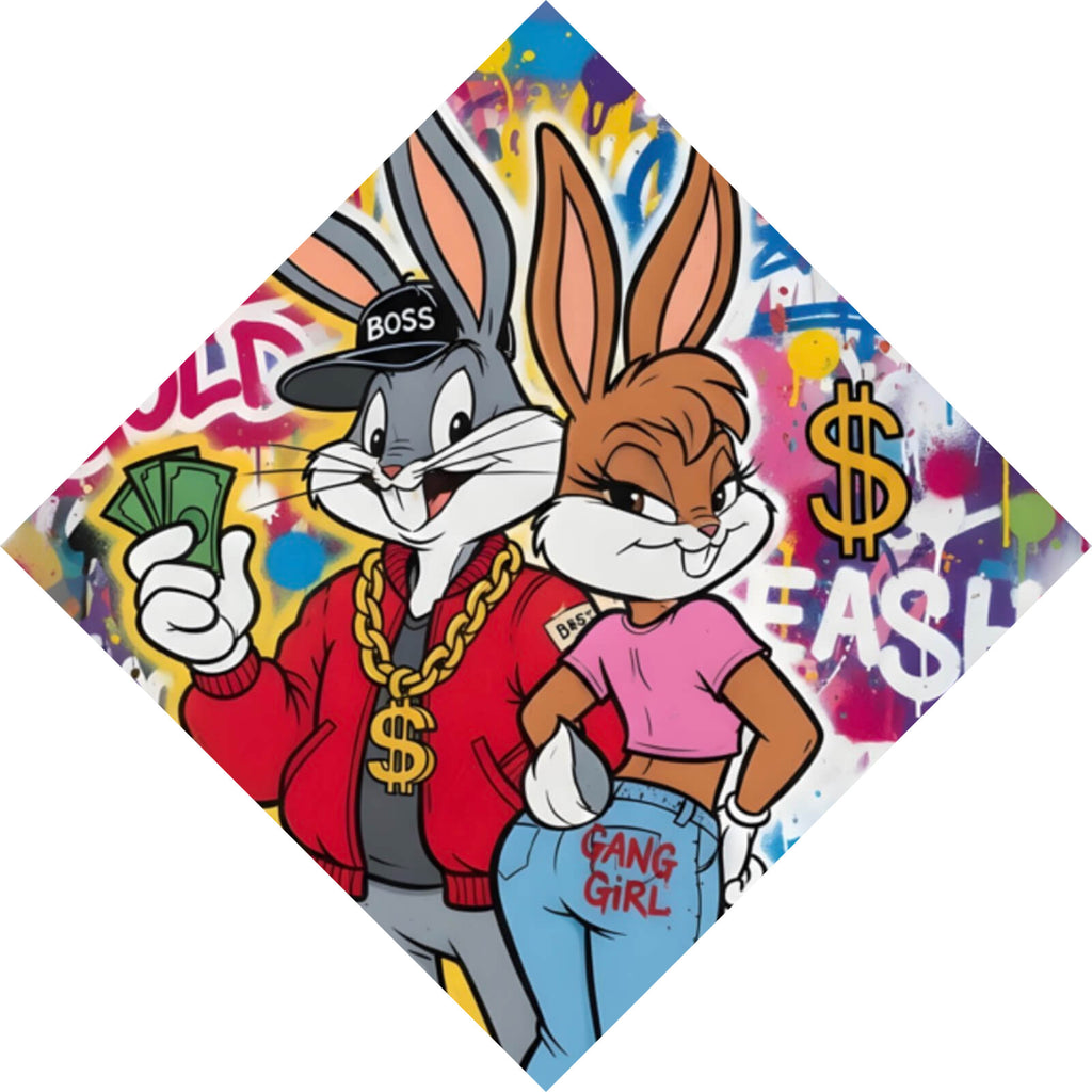 Dieses beeindruckende Wandbild kombiniert die Lebendigkeit von Graffiti mit der Verspieltheit von Cartoons und schafft so ein dynamisches Kunstwerk, das sowohl moderne als auch popkulturelle Elemente vereint. Die Figuren sind in einem urbanen Stil gehalten, der durch den starken Einsatz von Text und Symbolik ergänzt wird, was das Thema Geld und Luxus hervorhebt. Die ausgeprägte Materialanmutung des Sprühens verleiht dem Bild eine texturierte Tiefe, die in jedem Raum eine lebendige Atmosphäre schafft. Das Motiv zeigt zwei Cartoon-Charaktere, die durch ihre Haltung und Accessoires einen luxuriösen Lebensstil verkörpern. Diese stilvolle und kreative Darstellung zieht sofort die Aufmerksamkeit auf sich und dient als perfekter Blickfang in modernen Wohn- oder Arbeitsbereichen. Der Gesamteindruck ist kraftvoll und ausdrucksstark, was es zu einem idealen Statement-Stück für alle macht, die ihrer Umgebung einen Hauch von urbaner Coolness verleihen möchten. Durch die Mischung aus Humor und Gesellschaftskritik entsteht ein einzigartiges Kunstwerk, das sowohl zum Nachdenken anregt als auch unterhält.