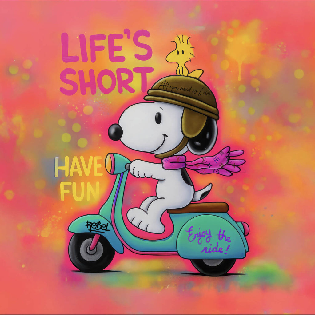 Das Bild zeigt eine fröhliche und bunte Illustration eines beliebten Cartoon-Hundes, der auf einem türkisfarbenen Roller sitzt. Der Hintergrund ist in lebhaften Pink- und Gelbtönen gehalten, die dem Bild eine energetische und fröhliche Ausstrahlung verleihen. Der Hund trägt einen braunen Helm, auf dem der Schriftzug "All you need is Love" zu sehen ist, und um seinen Hals flattert ein rosa Schal. Auf dem Roller sind die Worte "Enjoy the ride!" geschrieben, was die Botschaft des Bildes unterstreicht, nämlich das Leben zu genießen. Über dem Hund schwebt ein kleiner gelber Vogel, der ebenfalls aus der Cartoon-Welt bekannt ist. Der Hintergrund ist mit bunten Tupfen und Spritzern verziert, die dem Bild eine dynamische, graffitiartige Textur verleihen. Die Worte "Life's Short" und "Have Fun" sind in kräftigen Buchstaben im Hintergrund zu sehen und verstärken die lebensbejahende Botschaft des Kunstwerks. Dieses Bild ist eine Hommage an Freiheit, Abenteuer und die Freude am Leben, dargestellt in einem lebendigen und einladenden Stil.