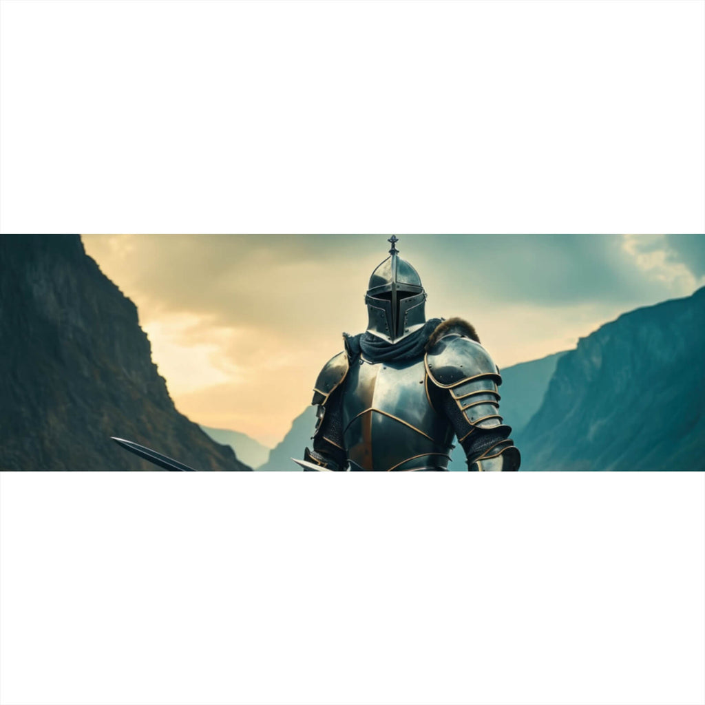Ein beeindruckendes Wandbild zeigt einen majestätischen Ritter, der in voller Rüstung in einer weiten, natürlichen Landschaft steht. Der Krieger hält zwei Schwerter, die seine Tapferkeit und Kampfbereitschaft symbolisieren. Die Szene zieht den Betrachter in eine epische Welt, in der mittelalterliche Helden und mythische Abenteuer lebendig werden. Die Rüstung glänzt im Licht und verleiht dem Ritter eine eindrucksvolle Präsenz, die sowohl Stärke als auch Respekt ausstrahlt. Die umgebende Landschaft verstärkt die epische Aura des Bildes und bietet Tiefe, die den Raum erweitert und eine mystische Atmosphäre schafft. Der Stil des Bildes vereint historische und moderne Elemente, was es zu einem faszinierenden Blickfang in jedem Raum macht. Ideal für diejenigen, die eine Vorliebe für Mythologie und Geschichte haben, bringt dieses Kunstwerk eine spirituelle und inspirierende Note in jede Umgebung. Es ist perfekt geeignet für Büros, Wohnzimmer oder Hobbyräume und spricht all jene an, die den Geist von Abenteuer und Tradition schätzen.