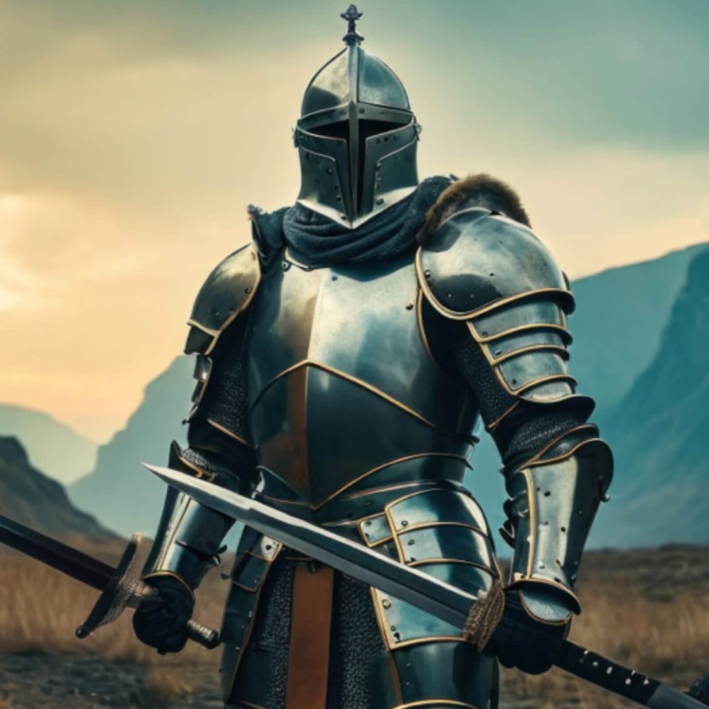 Ein beeindruckendes Wandbild zeigt einen majestätischen Ritter, der in voller Rüstung in einer weiten, natürlichen Landschaft steht. Der Krieger hält zwei Schwerter, die seine Tapferkeit und Kampfbereitschaft symbolisieren. Die Szene zieht den Betrachter in eine epische Welt, in der mittelalterliche Helden und mythische Abenteuer lebendig werden. Die Rüstung glänzt im Licht und verleiht dem Ritter eine eindrucksvolle Präsenz, die sowohl Stärke als auch Respekt ausstrahlt. Die umgebende Landschaft verstärkt die epische Aura des Bildes und bietet Tiefe, die den Raum erweitert und eine mystische Atmosphäre schafft. Der Stil des Bildes vereint historische und moderne Elemente, was es zu einem faszinierenden Blickfang in jedem Raum macht. Ideal für diejenigen, die eine Vorliebe für Mythologie und Geschichte haben, bringt dieses Kunstwerk eine spirituelle und inspirierende Note in jede Umgebung. Es ist perfekt geeignet für Büros, Wohnzimmer oder Hobbyräume und spricht all jene an, die den Geist von Abenteuer und Tradition schätzen.