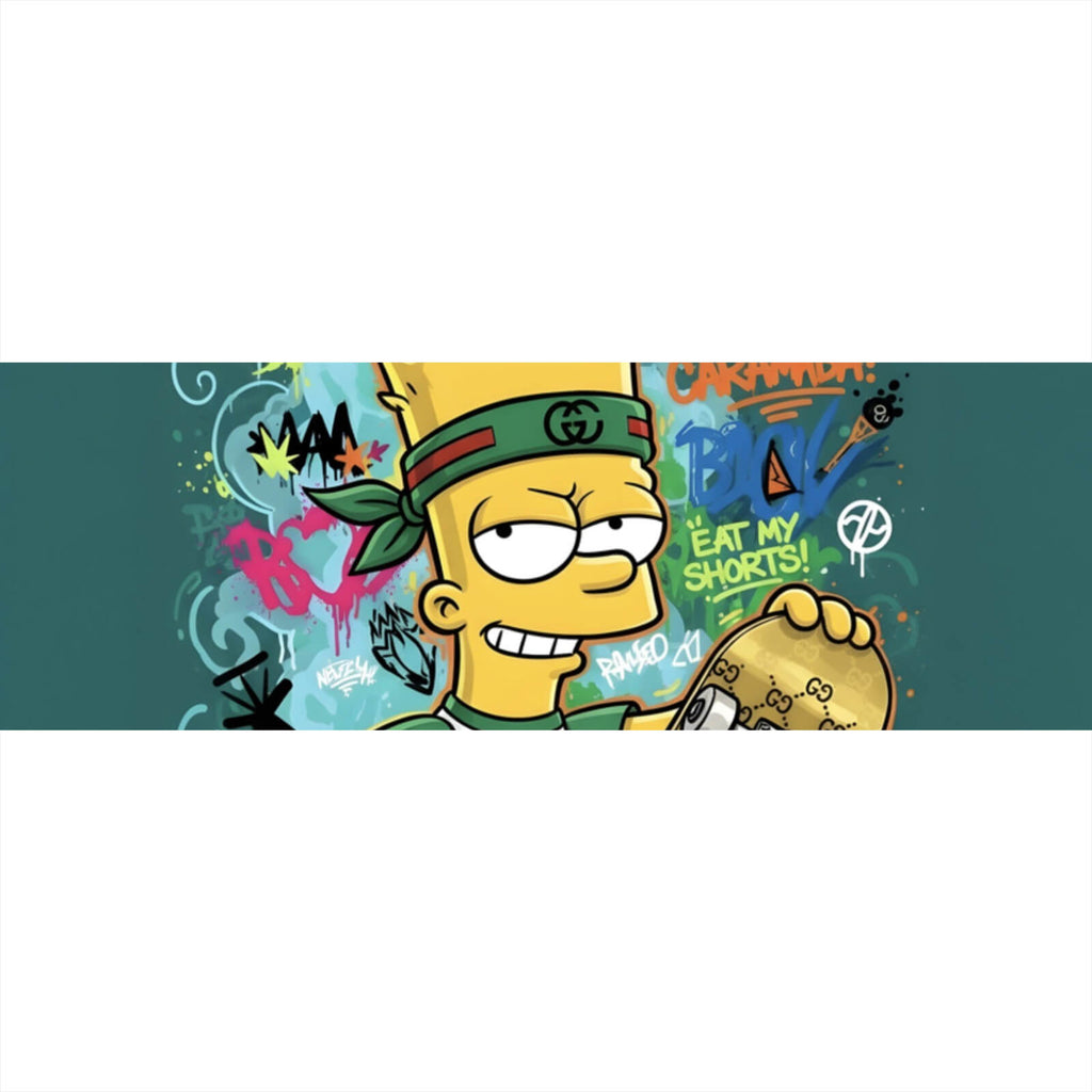 Dieses Wandbild zeigt ein auffälliges und lebendiges Cartoon-Motiv, das in einem modernen Graffiti-Stil gehalten ist. Im Zentrum steht eine ikonische Figur, die ein Skateboard lässig in der Hand hält, was dem Bild eine dynamische und jugendliche Ausstrahlung verleiht. Die umgebenden Graffiti-Elemente verstärken die urbane Atmosphäre und verleihen dem Raum, in dem dieses Bild präsentiert wird, einen Hauch von Rebellion und Kreativität. Die geschwungenen und kantigen Formen der Graffiti-Schriften ergänzen das zentrale Motiv perfekt und schaffen ein harmonisches und dennoch energiegeladenes Gesamtbild. Der Stil des Bildes ist eine moderne Interpretation von Pop Art und spiegelt aktuelle Trends wider, wodurch es sich ideal für kreative Räume wie Kinderzimmer oder Hobbyräume eignet. Die Tiefe und Textur des Designs verleihen dem Wandbild eine besondere Materialanmutung, die dem Raum eine lebendige und inspirierende Atmosphäre verleiht. Dieses Kunstwerk ist nicht nur ein Blickfang, sondern auch ein Ausdruck von Individualität und Stilbewusstsein, perfekt für alle, die ihre Umgebung mit einem zeitgemäßen und ausdrucksstarken Kunstwerk bereichern möchten.