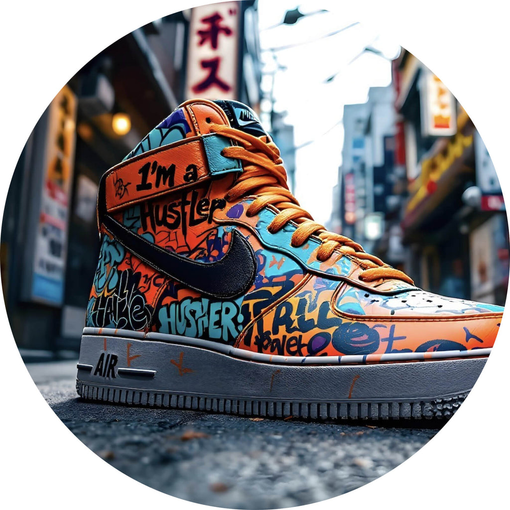 Dieses beeindruckende Wandbild zeigt einen Sneaker, der in einem urbanen Umfeld platziert ist, umgeben von typischen Straßenmotiven. Der Schuh ist mit auffälligen Graffiti-Elementen gestaltet, die moderne Streetart verkörpern und eine dynamische, energiegeladene Atmosphäre schaffen. Die detaillierte Gestaltung und der kreative Einsatz von Schriftzügen und Symbolen verleihen dem Bild Tiefe und einen einzigartigen Charakter. Diese Darstellung spricht besonders junge, trendbewusste Kunstliebhaber an, die sich für urbanes Design begeistern. Die kraftvolle Ausdrucksweise des Motivs wirkt inspirierend und sorgt für einen lebendigen Akzent in jedem Raum. Ideal für moderne Wohnzimmer oder Büros, wo es als stilvolles und innovatives Dekorationselement fungiert. Die Kombination aus Pop Art und Street Art Elementen macht dieses Werk zu einem energetischen Ausdruck des Zeitgeists, der Kreativität und Jugendlichkeit ausstrahlt.