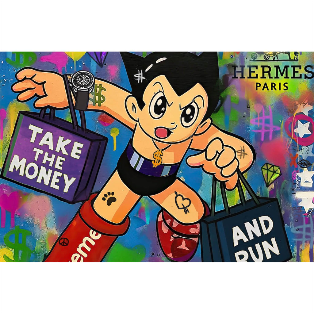 Auf der Suche nach einem ausgefallenen Wandbild als Aluminiumbild gebürstet? Das Motiv Take the Money and Run im Querformat gefällt dir und du hast nach Wandbildern mit den Wörtern Shopping, Luxus, Paris, Uhr, Pop Art, Spruch, Anime, Graffiti, Illustration, Cartoon, Marke, Humor, Lebendig und Street gesucht? Dann ist dieses Aluminiumbild gebürstet in der Farbe Bunt genau das richtige Wandbild und Dekorelement für dich! Setze ein Highlight an deiner Wand! Das Aluminiumbild gebürstet Take the Money and Run ist in 5 verschiedenen Größen verfügbar, von klein und dezent bis hin zum XXL Aluminiumbild gebürstet.