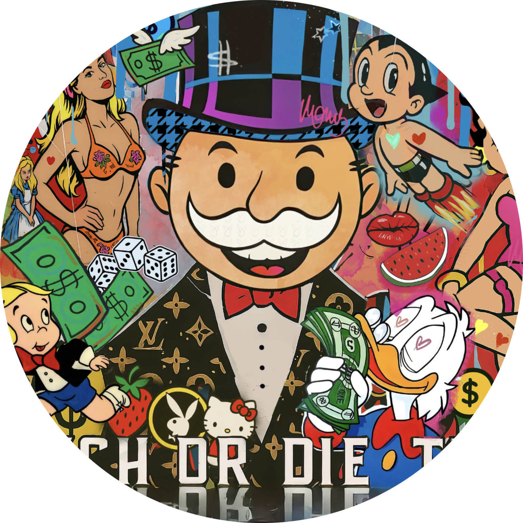Das Bild zeigt eine bunte Pop-Art-Collage voller ikonischer Comic- und Zeichentrickfiguren, die um ein zentrales Monopoly-Maskottchen herum arrangiert sind. Dieses trägt einen Zylinder und lächelt fröhlich, während es von verschiedenen symbolischen Elementen umgeben wird, die Reichtum und Kapitalismus darstellen. Fliegende Geldscheine mit Flügeln schweben durch das Bild, während Würfel und Dollarzeichen die Glücksspielelemente unterstreichen. Bekannte Figuren wie die von klassischen Cartoons und Comics fügen sich in die bunte Szene ein, darunter ein fliegender Junge mit Raketenstiefeln und eine Frau im roten Kleid. Im Hintergrund sind weitere popkulturelle Referenzen zu erkennen, die das Bild mit einem Hauch von Nostalgie versehen. Unten im Bild verläuft der provokante Schriftzug "GET RICH OR DIE TRYING", der den kapitalistischen Unterton der Collage verstärkt. Die leuchtenden Farben Blau, Rot und Grün dominieren das Bild und verleihen ihm eine lebendige, energiegeladene Atmosphäre. Diese Collage bringt humorvoll die Themen Reichtum, Konsum und Popkultur zusammen und lädt den Betrachter ein, über die Symbole und ihre Bedeutung nachzudenken.