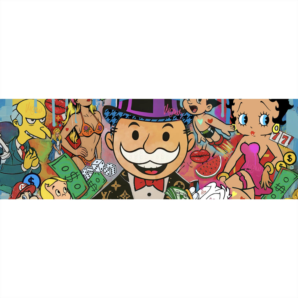 Das Bild zeigt eine bunte Pop-Art-Collage voller ikonischer Comic- und Zeichentrickfiguren, die um ein zentrales Monopoly-Maskottchen herum arrangiert sind. Dieses trägt einen Zylinder und lächelt fröhlich, während es von verschiedenen symbolischen Elementen umgeben wird, die Reichtum und Kapitalismus darstellen. Fliegende Geldscheine mit Flügeln schweben durch das Bild, während Würfel und Dollarzeichen die Glücksspielelemente unterstreichen. Bekannte Figuren wie die von klassischen Cartoons und Comics fügen sich in die bunte Szene ein, darunter ein fliegender Junge mit Raketenstiefeln und eine Frau im roten Kleid. Im Hintergrund sind weitere popkulturelle Referenzen zu erkennen, die das Bild mit einem Hauch von Nostalgie versehen. Unten im Bild verläuft der provokante Schriftzug "GET RICH OR DIE TRYING", der den kapitalistischen Unterton der Collage verstärkt. Die leuchtenden Farben Blau, Rot und Grün dominieren das Bild und verleihen ihm eine lebendige, energiegeladene Atmosphäre. Diese Collage bringt humorvoll die Themen Reichtum, Konsum und Popkultur zusammen und lädt den Betrachter ein, über die Symbole und ihre Bedeutung nachzudenken.