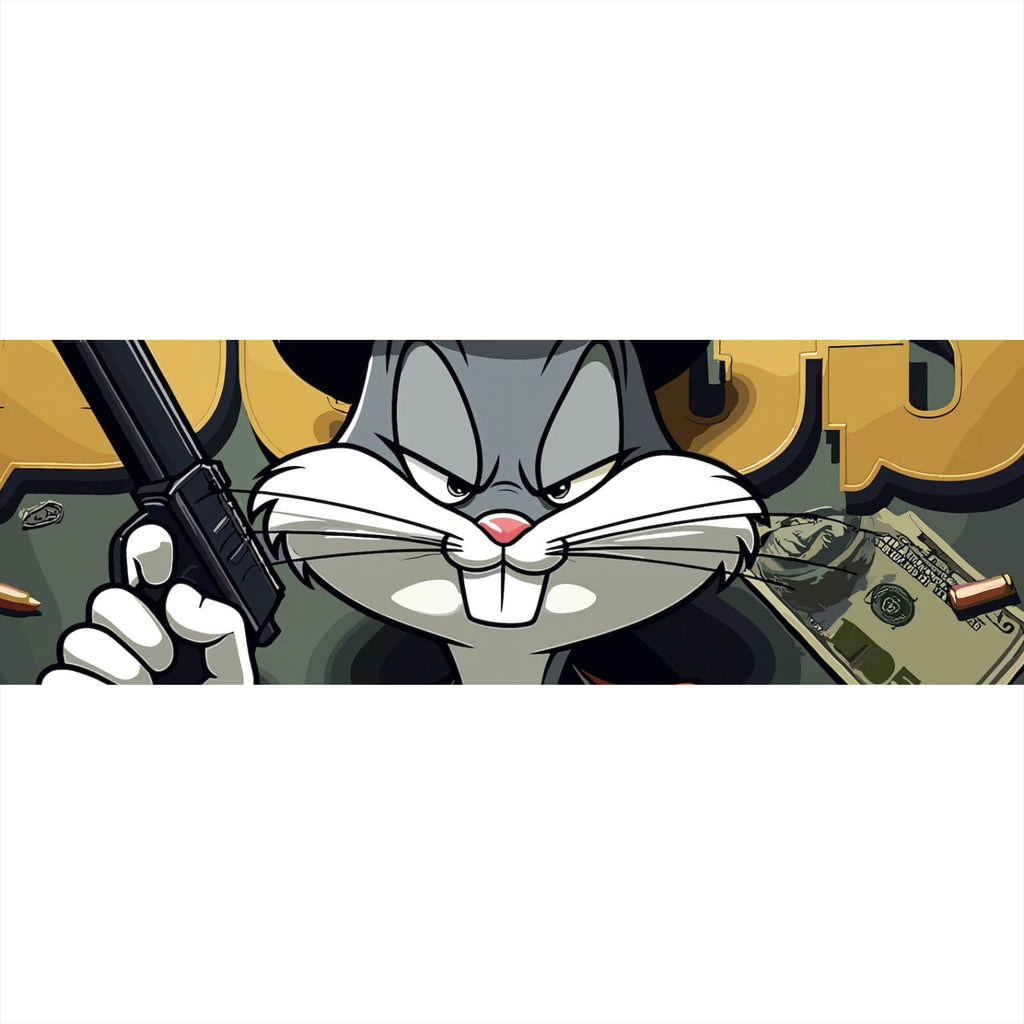 Dieses Wandbild zeigt einen charakteristischen Cartoon-Hasen, der in einem Zylinder und mit einer Pistole dargestellt wird. Das Motiv kombiniert Elemente von Humor und Pop Art und zieht sofort die Aufmerksamkeit auf sich. Der Hase steht im Mittelpunkt des Bildes und strahlt eine selbstbewusste und leicht herausfordernde Haltung aus, die durch seinen Gesichtsausdruck und die Position der Pistole unterstrichen wird. Der Zylinder verleiht dem Hasen einen Hauch von Eleganz und stellt einen faszinierenden Kontrast zu seiner ansonsten verspielten Erscheinung dar. Diese Darstellung vereint klassische Cartoon-Elemente mit moderner Kunst und schafft so ein einzigartiges, visuelles Statement, das sowohl in einem Wohnzimmer als auch in einem Büro oder Hobbyraum perfekt zur Geltung kommt. Die Linienführung ist klar und präzise, während die Komposition dem Bild Tiefe und Dynamik verleiht. Die Materialanmutung des Bildes deutet auf eine hochwertige Drucktechnik hin, die die Details und Texturen des Motivs eindrucksvoll zur Geltung bringt. Dieses Kunstwerk ist ideal für Liebhaber der Popkultur und bietet eine humorvolle und stilvolle Ergänzung zu jeder Wanddekoration.