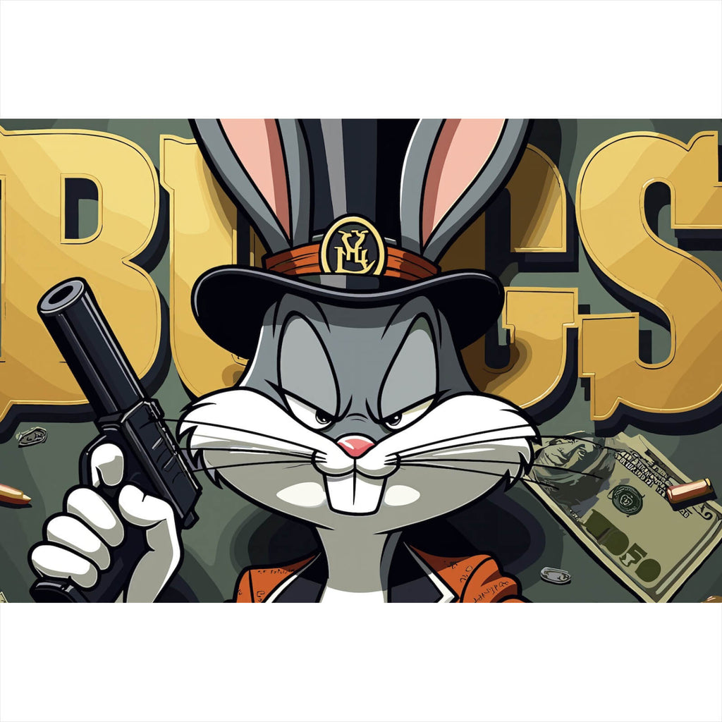 Dieses Wandbild zeigt einen charakteristischen Cartoon-Hasen, der in einem Zylinder und mit einer Pistole dargestellt wird. Das Motiv kombiniert Elemente von Humor und Pop Art und zieht sofort die Aufmerksamkeit auf sich. Der Hase steht im Mittelpunkt des Bildes und strahlt eine selbstbewusste und leicht herausfordernde Haltung aus, die durch seinen Gesichtsausdruck und die Position der Pistole unterstrichen wird. Der Zylinder verleiht dem Hasen einen Hauch von Eleganz und stellt einen faszinierenden Kontrast zu seiner ansonsten verspielten Erscheinung dar. Diese Darstellung vereint klassische Cartoon-Elemente mit moderner Kunst und schafft so ein einzigartiges, visuelles Statement, das sowohl in einem Wohnzimmer als auch in einem Büro oder Hobbyraum perfekt zur Geltung kommt. Die Linienführung ist klar und präzise, während die Komposition dem Bild Tiefe und Dynamik verleiht. Die Materialanmutung des Bildes deutet auf eine hochwertige Drucktechnik hin, die die Details und Texturen des Motivs eindrucksvoll zur Geltung bringt. Dieses Kunstwerk ist ideal für Liebhaber der Popkultur und bietet eine humorvolle und stilvolle Ergänzung zu jeder Wanddekoration.
