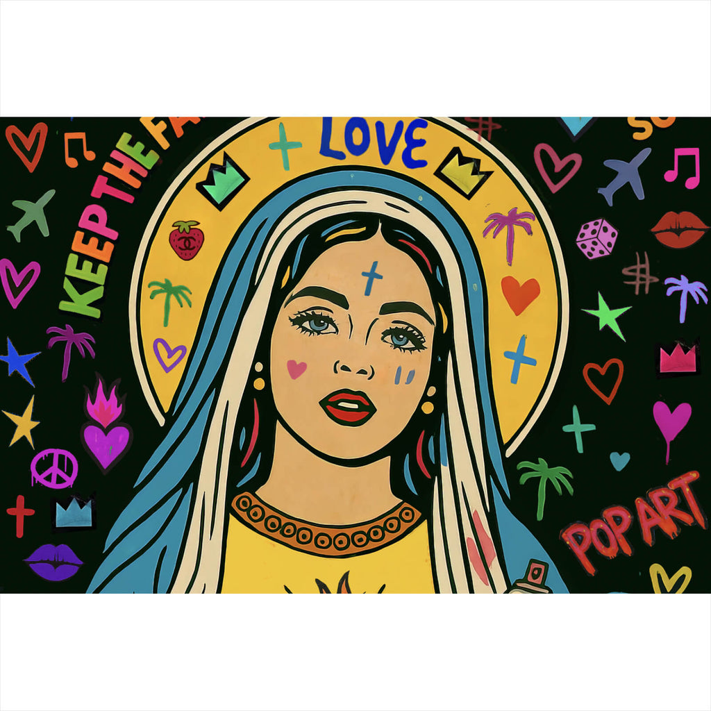 Das Bild zeigt eine moderne Darstellung der Heiligen Maria im Pop-Art- und Graffiti-Stil. Maria ist zentral im Bild positioniert, mit einem gelben Heiligenschein um ihren Kopf, der mit Symbolen wie Kreuzen und Kronen verziert ist. Sie trägt ein blaues Gewand mit weißen Akzenten, das an traditionelle Darstellungen erinnert. Auf ihrer Brust befindet sich ein rotes Herz mit Flammen, darüber das Wort "ART", was die Verbindung zwischen Spiritualität und Kunst symbolisiert. In ihrer rechten Hand hält sie eine pinke Spraydose, die auf den Einfluss der urbanen Street Art hinweist. Um sie herum sind zahlreiche bunte Symbole und Worte wie "KEEP THE FAITH", "LOVE", und "FREE SOUL" zu sehen. Diese Elemente verleihen dem Bild eine lebendige und moderne Atmosphäre, die traditionelle religiöse Ikonografie mit zeitgenössischer Kunst und jugendlicher Kultur verbindet. Die bunte Farbpalette und die Mischung aus verschiedenen Stilelementen machen das Bild zu einem ausdrucksstarken Kunstwerk, das sowohl spirituelle als auch kulturelle Themen anspricht.