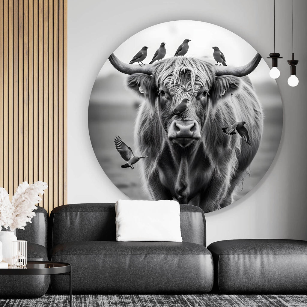 Das Wandbild zeigt ein majestätisches Hochlandrind, das mit seiner imposanten Präsenz im Mittelpunkt steht. Auf seinen geschwungenen Hörnern sitzen mehrere Vögel, was dem Bild eine faszinierende Symbiose von Tierarten verleiht. Unterhalb des Rinds schaut ein neugieriger Fuchs hervor, der dem Bild eine zusätzliche Dynamik und einen Hauch von Wildheit verleiht. Die gesamte Szene strahlt eine ruhige, fast meditative Atmosphäre aus, die perfekt für eine entspannende Raumgestaltung geeignet ist. Das Hochlandrind, bekannt für seine robuste Natur und seine lange, zottelige Fellstruktur, verleiht dem Bild eine eindrucksvolle Tiefe und Textur. Die Anordnung der Tiere und der Detailreichtum in der Darstellung machen das Bild zu einem echten Hingucker, der sowohl in modernen als auch in klassischen Interieur-Stilen hervorragend zur Geltung kommt. Die Verwendung von Schwarz-Weiß-Tönen unterstreicht die natürliche Eleganz und zeitlose Schönheit des Motivs. Ideal für Naturliebhaber und alle, die ihrem Zuhause oder Büro eine besondere Note verleihen möchten, wirkt dieses Wandbild beruhigend und inspirierend zugleich und schafft eine harmonische Verbindung zur Natur.