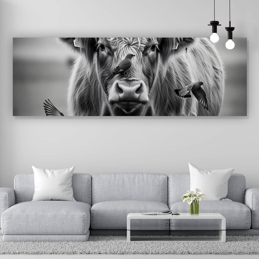 Das Wandbild zeigt ein majestätisches Hochlandrind, das mit seiner imposanten Präsenz im Mittelpunkt steht. Auf seinen geschwungenen Hörnern sitzen mehrere Vögel, was dem Bild eine faszinierende Symbiose von Tierarten verleiht. Unterhalb des Rinds schaut ein neugieriger Fuchs hervor, der dem Bild eine zusätzliche Dynamik und einen Hauch von Wildheit verleiht. Die gesamte Szene strahlt eine ruhige, fast meditative Atmosphäre aus, die perfekt für eine entspannende Raumgestaltung geeignet ist. Das Hochlandrind, bekannt für seine robuste Natur und seine lange, zottelige Fellstruktur, verleiht dem Bild eine eindrucksvolle Tiefe und Textur. Die Anordnung der Tiere und der Detailreichtum in der Darstellung machen das Bild zu einem echten Hingucker, der sowohl in modernen als auch in klassischen Interieur-Stilen hervorragend zur Geltung kommt. Die Verwendung von Schwarz-Weiß-Tönen unterstreicht die natürliche Eleganz und zeitlose Schönheit des Motivs. Ideal für Naturliebhaber und alle, die ihrem Zuhause oder Büro eine besondere Note verleihen möchten, wirkt dieses Wandbild beruhigend und inspirierend zugleich und schafft eine harmonische Verbindung zur Natur.