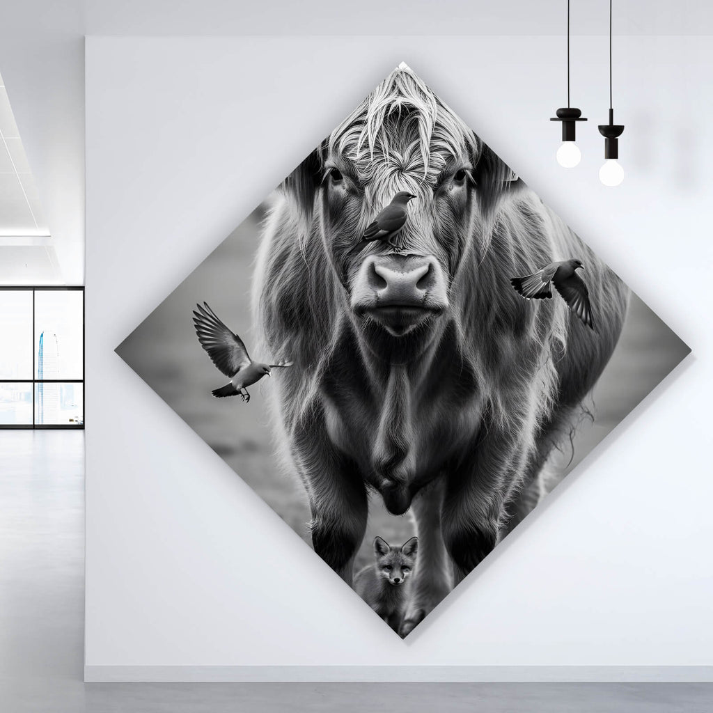 Auf der Suche nach einem ausgefallenen Wandbild als Aluminiumbild? Das Motiv Hochlandrind mit Vögeln und Fuchs als Raute gefällt dir und du hast nach Wandbildern mit den Wörtern Tiere, Hochlandrind, Vögel, Fuchs, Natur, Fotografie, Land, Ruhe, Harmonie, Ausdruck und Freunde gesucht? Dann ist dieses Aluminiumbild in der Farbe Schwarz-Weiß genau das richtige Wandbild und Dekorelement für dich! Setze ein Highlight an deiner Wand! Das Aluminiumbild Hochlandrind mit Vögeln und Fuchs ist in 4 verschiedenen Größen verfügbar, von klein und dezent bis hin zum XXL Aluminiumbild.