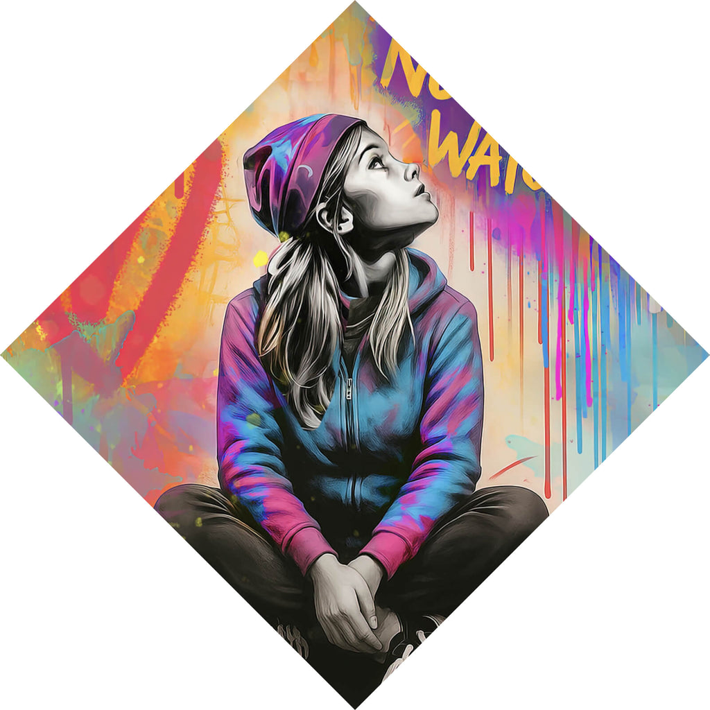 Auf dem Bild ist eine junge Frau zu sehen, die lässig auf einem Podest sitzt. Sie trägt einen farbenfrohen Hoodie und eine Mütze, die ihr Gesicht umrahmen. Ihre Beine sind verschränkt, und sie trägt schwarze Sneakers mit weißen Schnürsenkeln. Der Hintergrund ist lebendig und voller Farben, mit Spritzern und Graffiti-Elementen, die eine urbane Atmosphäre schaffen. Mehrere Vögel sind in verschiedenen Farben fliegend dargestellt, und ein großes, rotes Herz ist prominent zu sehen. Der Schriftzug „Dream Like Nobody’s Watching“ in gelber Farbe hebt sich deutlich ab und vermittelt eine inspirierende Botschaft. Die Mischung aus Farben, Formen und dem nachdenklichen Gesichtsausdruck der jungen Frau erzeugt ein Gefühl von Freiheit und Kreativität. Das Bild vermittelt eine positive, motivierende Energie, die dazu ermutigt, seine Träume zu verfolgen, ohne sich von äußeren Einflüssen ablenken zu lassen. Es spiegelt den Geist der Jugend und die Kraft der Vorstellung wider, während es gleichzeitig die urbane Kunstszene feiert.