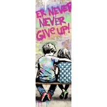 Das Bild zeigt zwei Kinder, die eng nebeneinander auf einer Holzbank sitzen. Sie sind von hinten zu sehen, der Junge legt seinen Arm um das Mädchen, was ein Gefühl von Freundschaft und Zusammenhalt vermittelt. Beide tragen legere Kleidung, die mit bunten Farbspritzern verziert ist, was dem Bild eine lebendige und künstlerische Note verleiht. Neben dem Jungen sitzt ein kleiner Hund, der aufmerksam in die gleiche Richtung wie die Kinder schaut. Rechts von der Bank schwebt ein roter Herzballon, der durch eine Schnur mit dem Boden verbunden ist. Im Hintergrund ist eine Wand zu sehen, die mit verschiedenen Graffiti und Farbflecken übersät ist. Dominant erscheint der Schriftzug „NEVER NEVER NEVER GIVE UP!“ in kräftigem Pink, der als zentrale Botschaft des Bildes fungiert und den Betrachter zu Optimismus und Ausdauer ermutigt. Die Verwendung von leuchtenden Farben und dynamischen Elementen verleiht dem Bild eine positive und energiegeladene Atmosphäre. Die Szene erinnert an die Werke von Streetart-Künstlern und vermittelt eine starke Botschaft der Hoffnung und des nie aufgebenden Geistes. Die Kombination aus kindlicher Unschuld, Kunst und motivierenden Worten macht das Bild zu einem inspirierenden Kunstwerk, das sowohl ästhetisch ansprechend als auch emotional berührend ist.