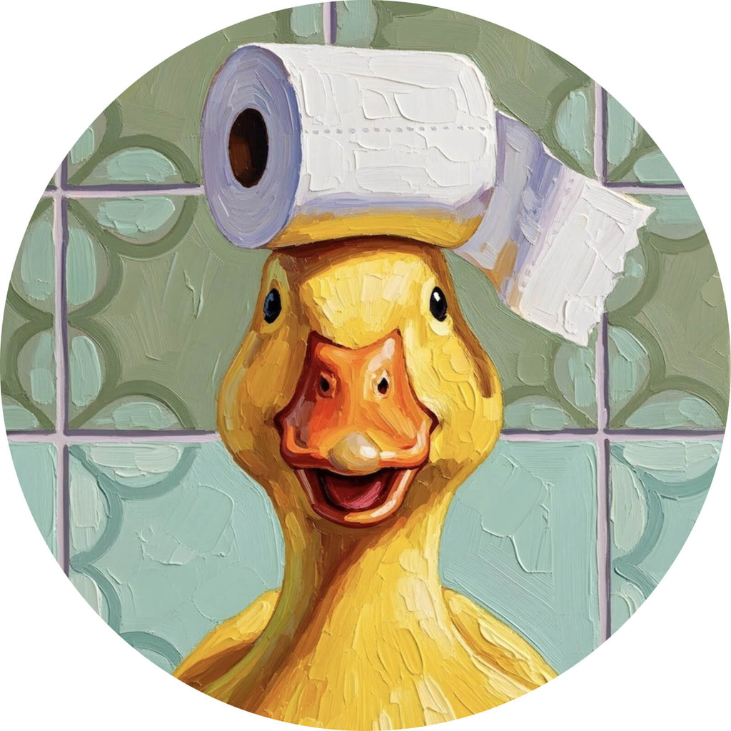 Dieses lustige Wandbild zeigt eine charmante Ente mit einem humorvollen Ausdruck, die in einem Badezimmer-Setting steht. Auf dem Kopf der Ente thront unerwartet eine Toilettenpapierrolle, was dem Bild eine skurrile und humorvolle Note verleiht. Die Ente ist mit kräftigen Pinselstrichen gemalt, was dem Bild eine dynamische und lebendige Anmutung gibt. Der Hintergrund besteht aus stilisierten Fliesen, die das Badezimmer-Thema unterstreichen und einen interessanten Kontrast zum Hauptmotiv bieten. Das Bild kombiniert Elemente der Modern Art und Pop Art, um eine einzigartige visuelle Wirkung zu erzielen. Es eignet sich perfekt als humorvoller Akzent in einem Badezimmer oder jedem Raum, der einen Hauch von Originalität und Spaß benötigt. Die Komposition zieht sofort die Aufmerksamkeit auf sich und bringt Betrachter zum Schmunzeln, während sie gleichzeitig als stilvolles Dekorationselement dient. Die Materialanmutung des Gemäldes vermittelt eine gewisse Tiefe, die durch die Schichtung der Farben erreicht wird, und die Form der Ente sorgt für eine ansprechende Raumwirkung. Dieses Bild ist ideal für alle, die Kunst mit einem Augenzwinkern schätzen und ihren Wohnräumen eine persönliche Note verleihen möchten.