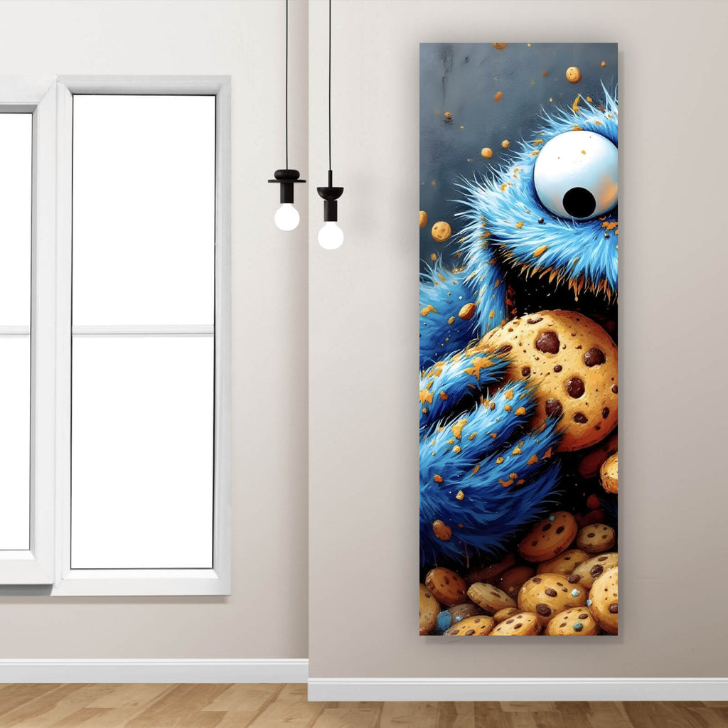 Dieses Wandbild zeigt eine lustige, cartoonhafte Figur, die mit großen Augen und einem riesigen Lächeln zahlreiche Kekse verschlingt. Die Szene ist voller Energie und Bewegung, da die Kekse regelrecht durch die Luft fliegen, was eine dynamische und lebhafte Atmosphäre erzeugt. Die Figur wirkt fröhlich und unbeschwert, was dem Bild eine humorvolle und verspielte Note verleiht. Der Stil des Bildes ist stark von Pop Art inspiriert, mit klaren Linien und einer ausdrucksstarken Darstellung. Die Materialanmutung vermittelt einen modernen, künstlerischen Eindruck, der perfekt in ein kreatives Ambiente passt. Durch die Fülle der Kekse und die lebendige Mimik der Figur entsteht eine gewisse Tiefe, die das Bild besonders interessant macht. Ideal für Räume, in denen eine fröhliche und lockere Stimmung gewünscht ist, wie Kinderzimmer oder Küchen. Es zieht sofort die Aufmerksamkeit auf sich und sorgt für Unterhaltung und Gesprächsstoff. Die Kombination aus Humor und Kunst macht dieses Wandbild zu einem einzigartigen Dekorationsstück, das sowohl Kinder als auch Erwachsene anspricht. Die Raumwirkung ist einladend und charmant, perfekt, um jedem Raum eine besondere Note zu verleihen.