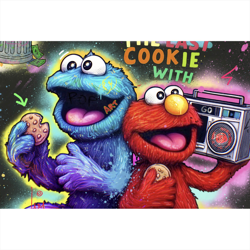 Das Bild zeigt eine lebendige, farbenfrohe Illustration, die zwei ikonische Figuren darstellt. Der blaue Charakter hält einen Keks in der Hand und hat ein fröhliches Lächeln im Gesicht. Neben ihm sitzt der rote Charakter, der ebenfalls einen Keks genießt und ein großes, altes Radio hält. Beide Figuren sitzen auf einer Kiste, die mit der Aufschrift "Sesame Street" versehen ist. Diese Szene strahlt eine warme, fröhliche Atmosphäre aus und vermittelt ein Gefühl von Gemeinschaft und Freundschaft. Im Hintergrund ist ein grüner Charakter zu sehen, der aus einem Mülleimer hervorlugt, um die Szene zu beobachten. Die Umgebung ist mit leuchtenden Farben und Spritzern gestaltet, was dem Ganzen einen dynamischen, pop-artigen Stil verleiht. Der Schriftzug „A friend is someone to share the last cookie with“ ergänzt die Szene perfekt, indem er die Bedeutung der Freundschaft unterstreicht. Die Mischung aus Graffiti-Elementen und leuchtenden Farben gibt dem Bild eine einzigartige, kreative Note, die sowohl Kinder als auch Erwachsene anspricht.