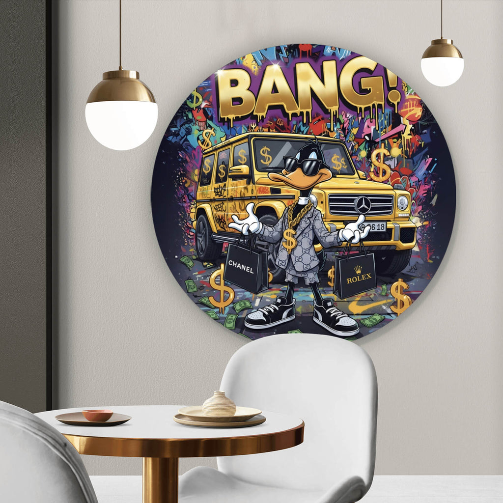 Auf der Suche nach einem ausgefallenen Wandbild als Aluminiumbild? Das Motiv Luxus Ente mit Auto und Geld als Kreis gefällt dir und du hast nach Wandbildern mit den Wörtern Ente, Luxus, Auto, Geld, Marken, Grafitti, Glamour, Humor, Statement, Tier, Zeichentrick und Pop Art gesucht? Dann ist dieses Aluminiumbild in der Farbe Bunt genau das richtige Wandbild und Dekorelement für dich! Setze ein Highlight an deiner Wand! Das Aluminiumbild Luxus Ente mit Auto und Geld ist in 5 verschiedenen Größen verfügbar, von klein und dezent bis hin zum XXL Aluminiumbild.