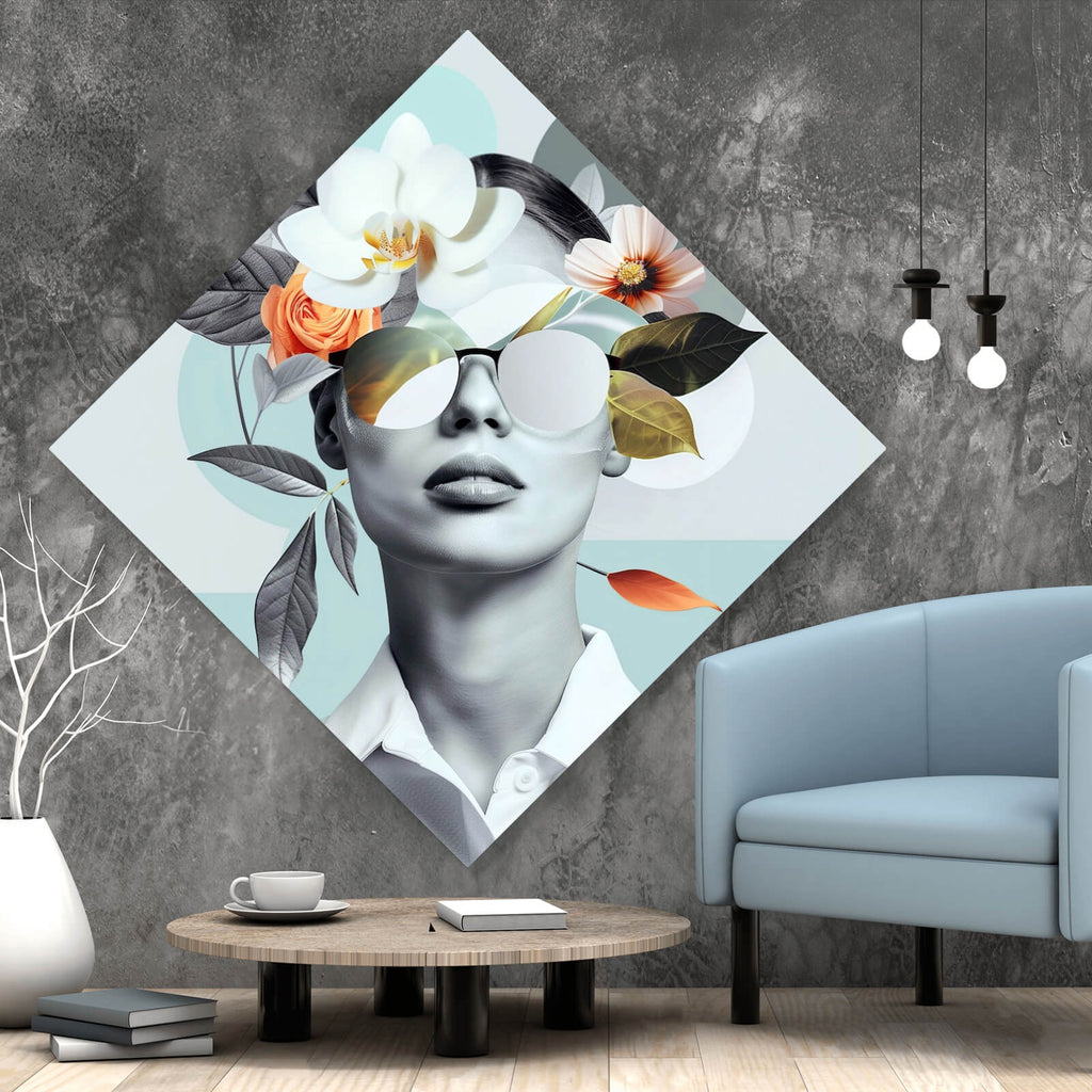 Auf der Suche nach einem ausgefallenen Wandbild als Aluminiumbild? Das Motiv Modernes Porträt mit Blumenarrangement als Raute gefällt dir und du hast nach Wandbildern mit den Wörtern Portrait, Frau, Blumen, Brille, Ausdruck, Eleganz, Schönheit, Inspiration, Kreativität, Collage, Ästhetik, Harmonie und Modern Art gesucht? Dann ist dieses Aluminiumbild in der Farbe Bunt genau das richtige Wandbild und Dekorelement für dich! Setze ein Highlight an deiner Wand! Das Aluminiumbild Modernes Porträt mit Blumenarrangement ist in 4 verschiedenen Größen verfügbar, von klein und dezent bis hin zum XXL Aluminiumbild.