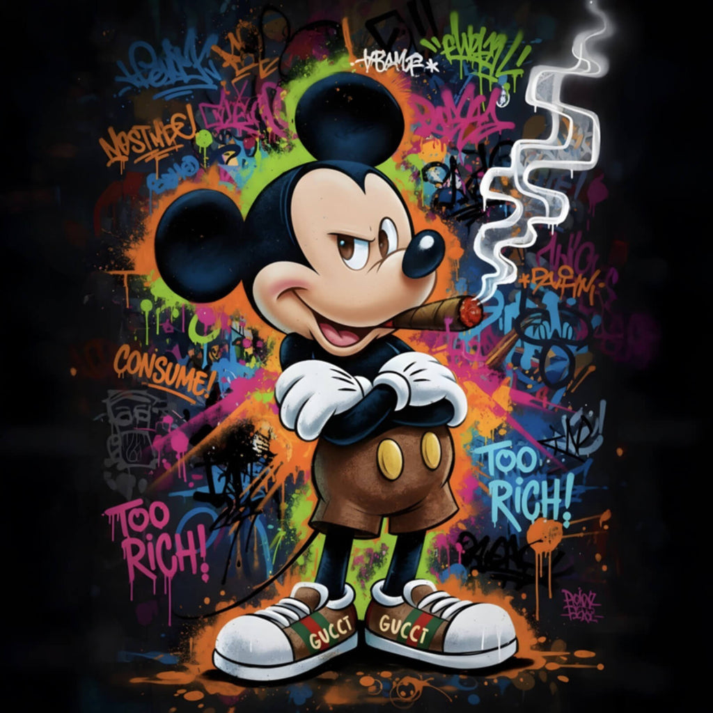 Dieses Wandbild zeigt einen ikonischen Charakter im modernen Graffiti-Stil, der sich perfekt als auffälliges Statement-Piece eignet. Der Charakter steht im Mittelpunkt des Bildes und ist von lebhaften, dynamischen Graffiti-Elementen umgeben, die das Bild zu einem echten Hingucker machen. Durch den urbanen Pop-Art-Stil wirkt das Bild sowohl zeitgenössisch als auch kunstvoll, was es ideal für moderne Räume macht. Die Mischung aus abstrakten Formen und klaren Linien verleiht ihm eine besondere Tiefe und Struktur, die das Bild lebendig erscheinen lässt. Die Materialanmutung ist hochwertig, was dem Bild eine exklusive und stilvolle Ausstrahlung verleiht. Es eignet sich hervorragend für Räume, die eine kreative und trendige Atmosphäre ausstrahlen sollen, wie Wohnzimmer, Bars oder Büros. Dieses Kunstwerk ist nicht nur dekorativ, sondern auch ein Ausdruck von Individualität und modernem Lebensstil. Die Kombination aus Grunge-Elementen und Pop-Art macht es zu einem vielseitigen Kunstwerk, das in verschiedenen Einrichtungskonzepten integriert werden kann. Das Bild hat eine starke Präsenz und zieht die Aufmerksamkeit auf sich, wodurch es zu einem zentralen Punkt in jedem Raum wird. Es ist ein Muss für Kunstliebhaber, die nach etwas Besonderem und Einzigartigem suchen, um ihre Wanddekoration auf ein neues Niveau zu heben.