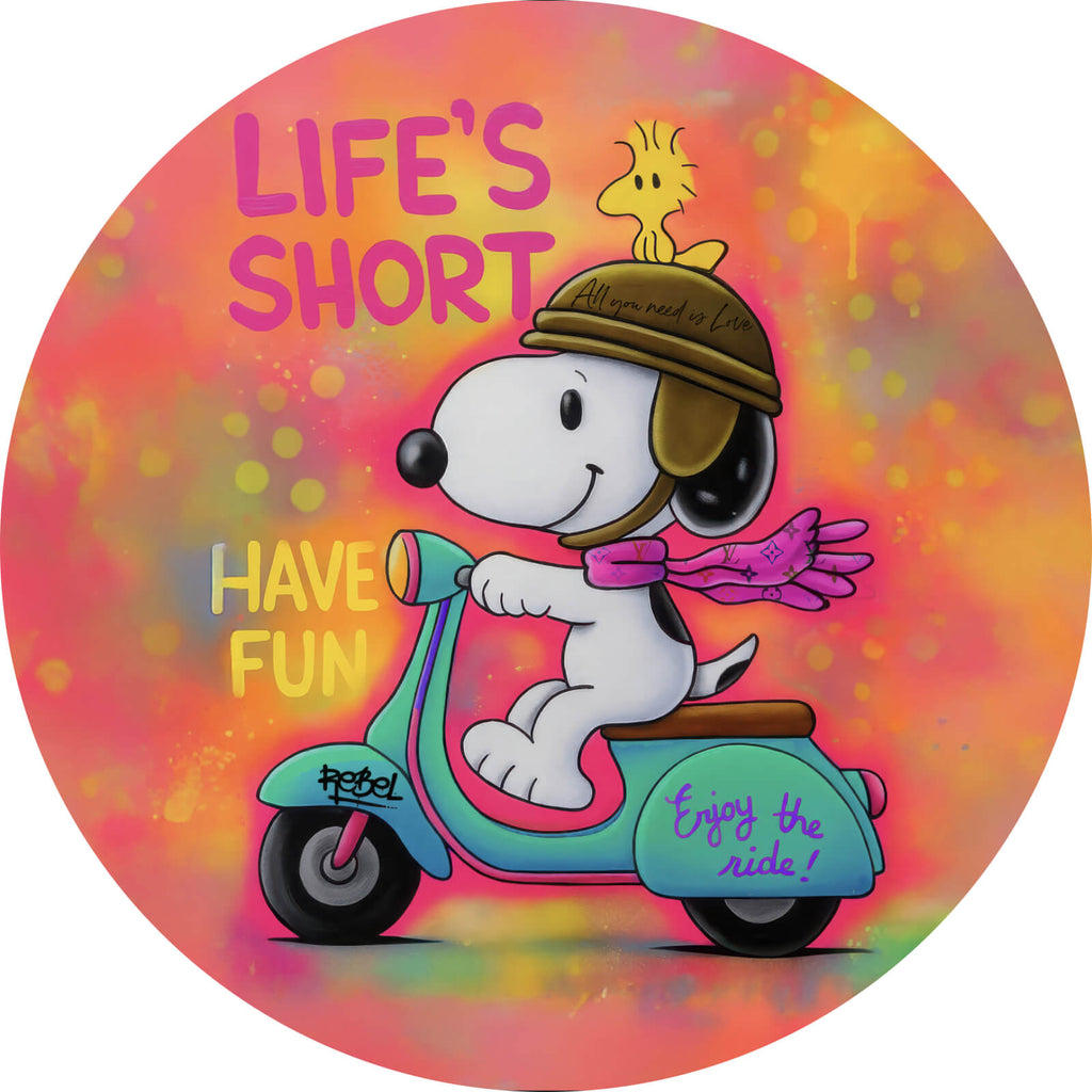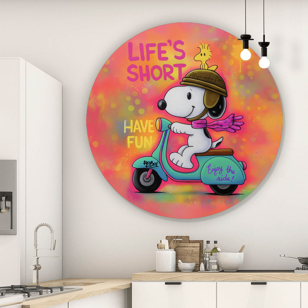 Das Bild zeigt eine fröhliche und bunte Illustration eines beliebten Cartoon-Hundes, der auf einem türkisfarbenen Roller sitzt. Der Hintergrund ist in lebhaften Pink- und Gelbtönen gehalten, die dem Bild eine energetische und fröhliche Ausstrahlung verleihen. Der Hund trägt einen braunen Helm, auf dem der Schriftzug "All you need is Love" zu sehen ist, und um seinen Hals flattert ein rosa Schal. Auf dem Roller sind die Worte "Enjoy the ride!" geschrieben, was die Botschaft des Bildes unterstreicht, nämlich das Leben zu genießen. Über dem Hund schwebt ein kleiner gelber Vogel, der ebenfalls aus der Cartoon-Welt bekannt ist. Der Hintergrund ist mit bunten Tupfen und Spritzern verziert, die dem Bild eine dynamische, graffitiartige Textur verleihen. Die Worte "Life's Short" und "Have Fun" sind in kräftigen Buchstaben im Hintergrund zu sehen und verstärken die lebensbejahende Botschaft des Kunstwerks. Dieses Bild ist eine Hommage an Freiheit, Abenteuer und die Freude am Leben, dargestellt in einem lebendigen und einladenden Stil.