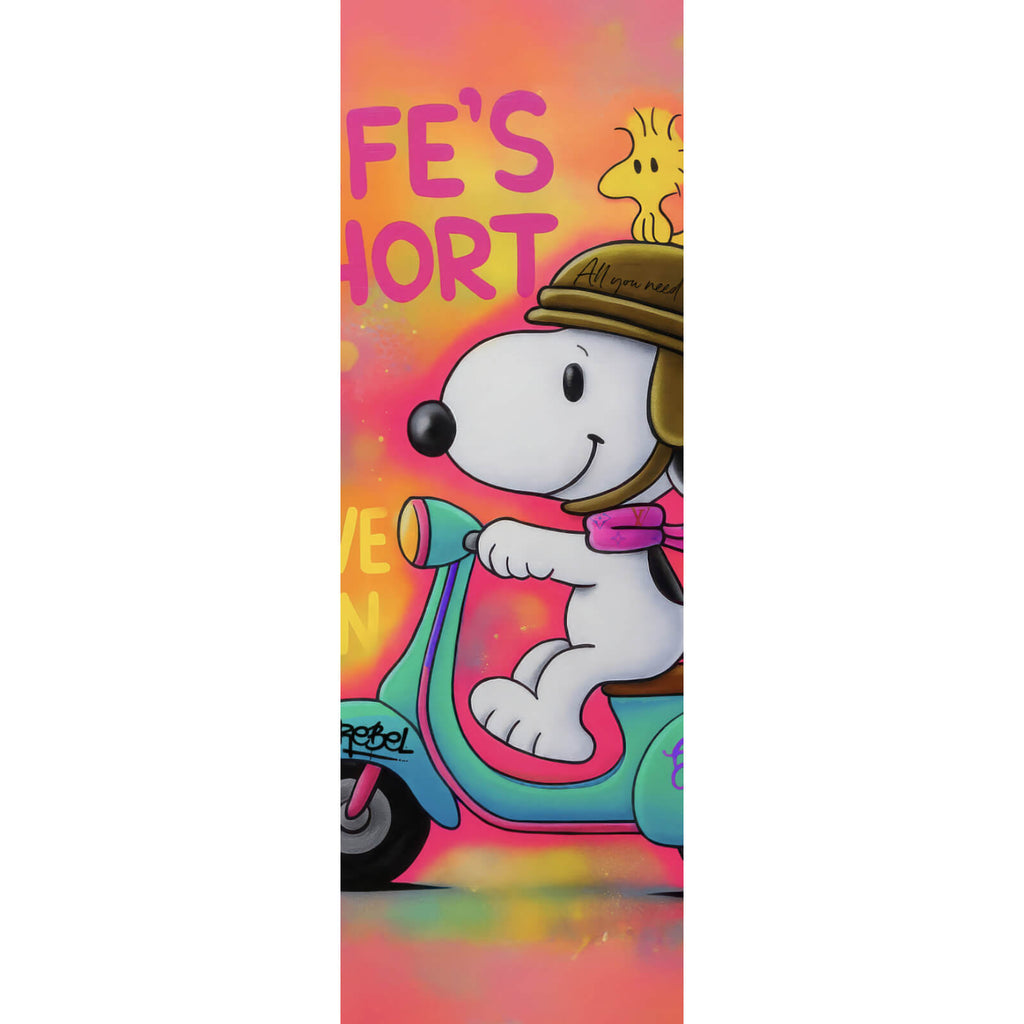 Das Bild zeigt eine fröhliche und bunte Illustration eines beliebten Cartoon-Hundes, der auf einem türkisfarbenen Roller sitzt. Der Hintergrund ist in lebhaften Pink- und Gelbtönen gehalten, die dem Bild eine energetische und fröhliche Ausstrahlung verleihen. Der Hund trägt einen braunen Helm, auf dem der Schriftzug "All you need is Love" zu sehen ist, und um seinen Hals flattert ein rosa Schal. Auf dem Roller sind die Worte "Enjoy the ride!" geschrieben, was die Botschaft des Bildes unterstreicht, nämlich das Leben zu genießen. Über dem Hund schwebt ein kleiner gelber Vogel, der ebenfalls aus der Cartoon-Welt bekannt ist. Der Hintergrund ist mit bunten Tupfen und Spritzern verziert, die dem Bild eine dynamische, graffitiartige Textur verleihen. Die Worte "Life's Short" und "Have Fun" sind in kräftigen Buchstaben im Hintergrund zu sehen und verstärken die lebensbejahende Botschaft des Kunstwerks. Dieses Bild ist eine Hommage an Freiheit, Abenteuer und die Freude am Leben, dargestellt in einem lebendigen und einladenden Stil.