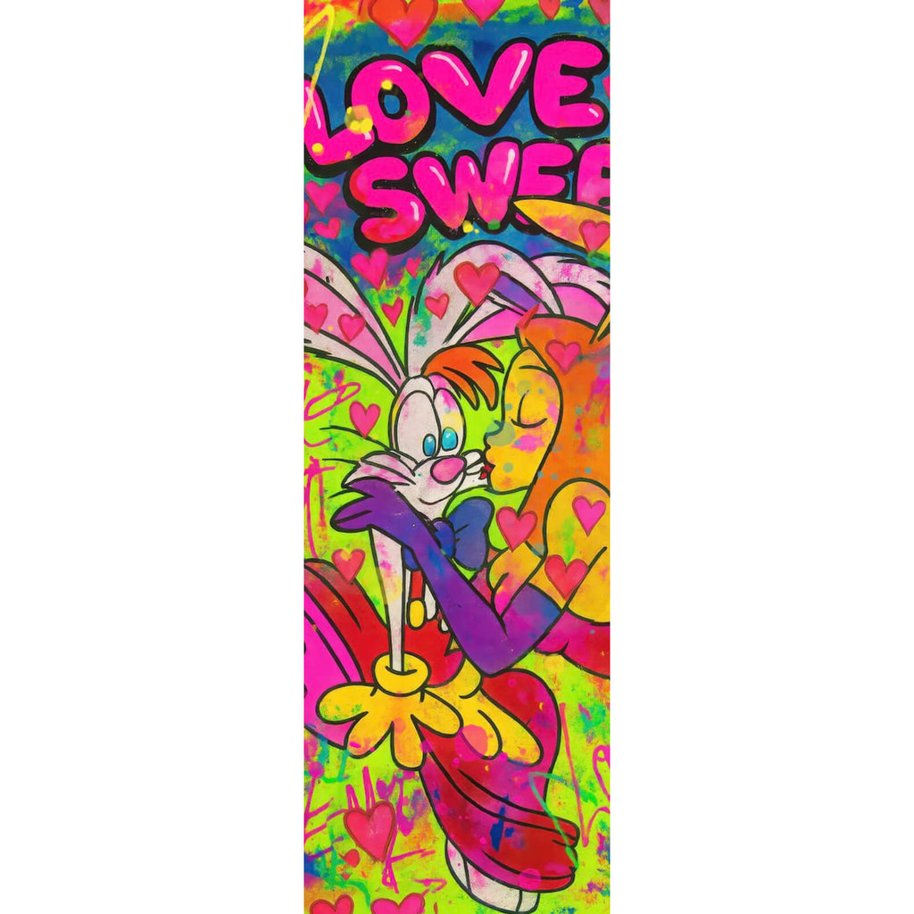 Dieses beeindruckende Wandbild im Pop Art Stil zeigt ein Liebespaar in einer lebhaften und ausdrucksstarken Darstellung, umgeben von zahlreichen Herzen und dem markanten Spruch "Love is Sweet". Die dynamische Komposition und die Verwendung von kontrastreichen Formen und Linien verleihen dem Bild eine kraftvolle visuelle Anziehungskraft. Die moderne Kunst verschmilzt mit romantischen Elementen und schafft eine lebendige Atmosphäre, die sowohl Fröhlichkeit als auch tiefe Zuneigung ausdrückt. Der Spruch verstärkt die emotionale Wirkung und macht das Bild zu einem perfekten Ausdruck von Liebe und Freude. Die künstlerische Gestaltung und die energetische Ausstrahlung des Bildes machen es ideal für zeitgenössische Wohnräume, in denen es eine positive und inspirierende Stimmung verbreitet. Die Kombination aus modernem Design und klassischem Pop Art Stil verleiht jedem Raum eine besondere Note und zieht die Blicke auf sich. Dieses Werk eignet sich ausgezeichnet als auffälliges Dekorationselement in Wohnzimmern, Schlafzimmern, Kinderzimmern oder auch Büros, wo es Kreativität und Lebensfreude fördert.