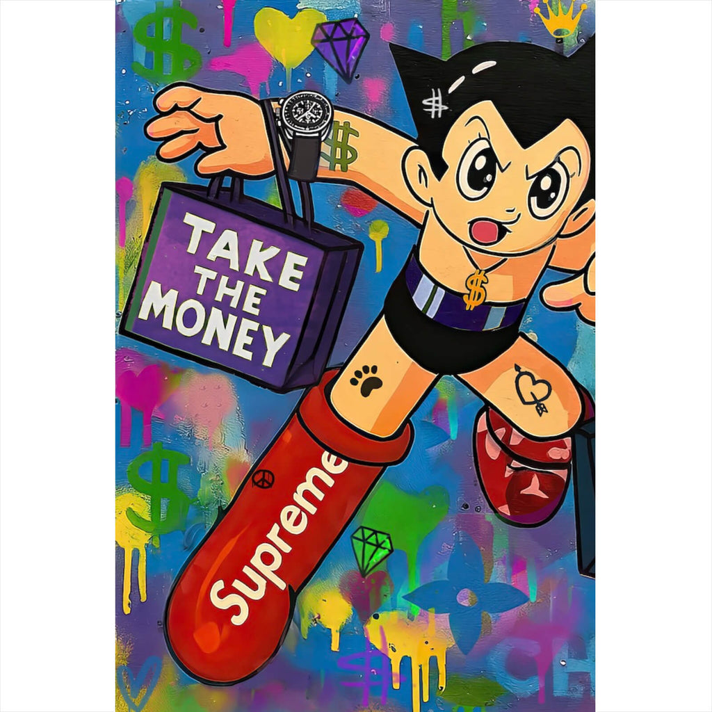 Auf der Suche nach einem ausgefallenen Wandbild als Aluminiumbild? Das Motiv Take the Money and Run im Hochformat gefällt dir und du hast nach Wandbildern mit den Wörtern Shopping, Luxus, Paris, Uhr, Pop Art, Spruch, Anime, Graffiti, Illustration, Cartoon, Marke, Humor, Lebendig und Street gesucht? Dann ist dieses Aluminiumbild in der Farbe Bunt genau das richtige Wandbild und Dekorelement für dich! Setze ein Highlight an deiner Wand! Das Aluminiumbild Take the Money and Run ist in 5 verschiedenen Größen verfügbar, von klein und dezent bis hin zum XXL Aluminiumbild.