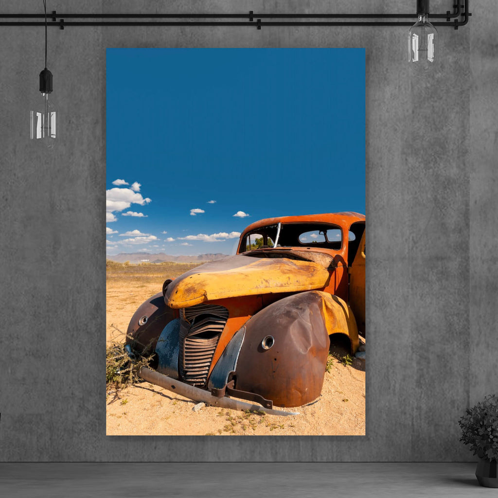 Das Bild zeigt ein verlassenes Oldtimer-Auto, das in einer kargen Wüstenlandschaft steht. Dieses beeindruckende Motiv verkörpert eine starke Nostalgie und erzählt von vergangenen Zeiten und Abenteuern. Die rostige Karosserie des Autos, zusammen mit der offenen Tür, vermittelt den Eindruck von Verlassenheit und Einsamkeit. Im Hintergrund erstreckt sich eine weite, unberührte Landschaft, die den Blick in die Ferne schweifen lässt und dem Bild eine ausgedehnte Tiefe verleiht. Der Himmel darüber ist klar und wolkenlos, was die ruhige und stille Atmosphäre des Ortes unterstreicht. Dieses Wandbild eignet sich ideal für Liebhaber klassischer Fahrzeuge und Abenteuersuchende, da es sowohl die Faszination für Technik als auch die Schönheit der Natur miteinander verbindet. Der Vintage-Look des Bildes fügt jedem Raum eine rustikale und nostalgische Note hinzu, während der Kontrast zwischen dem alten Auto und der weiten Landschaft eine einzigartige visuelle Anziehungskraft schafft. Dieses Bild ist perfekt für Räume, die eine Mischung aus Geschichte und Abenteuerlust ausstrahlen sollen.