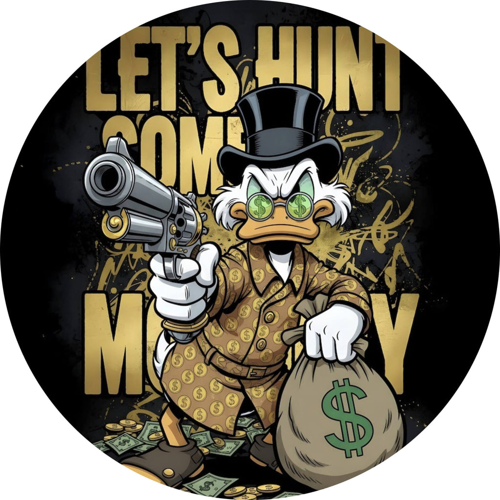 Das Bild zeigt eine stilisierte Cartoon-Ente in einem auffälligen Gangster-Outfit. Die Ente trägt einen schwarzen Zylinder und eine auffällige, mit Dollarzeichen verzierte Jacke. In der einen Hand hält sie eine große Pistole, während die andere Hand einen prall gefüllten Geldsack mit einem großen Dollarzeichen umklammert. Die Entenaugen sind mit grünen Dollarzeichen überlagert, was auf ein Motiv von Reichtum und Geldjagd hinweist. Im Hintergrund sind große, goldene Buchstaben zu sehen, die dem Bild einen starken Kontrast verleihen. Die Farbpalette des Bildes besteht hauptsächlich aus Schwarz, Gold und Grün, was die luxuriöse und humorvolle Darstellung unterstreicht. Das Bild ist eine künstlerische Satire auf das Streben nach Reichtum und Macht, typisch für den Comicstil, und zieht mit seiner lebendigen und humorvollen Darstellung die Aufmerksamkeit auf sich. Die Kombination von klassischen Cartoon-Elementen mit modernen, satirischen Akzenten macht es zu einem einzigartigen Kunstwerk, das sowohl Fans von Pop-Art als auch von traditioneller Comic-Kunst anspricht. Dieses Bild ist ideal für alle, die eine Vorliebe für humorvolle und aussagekräftige Illustrationen haben, die sowohl unterhalten als auch zum Nachdenken anregen.
