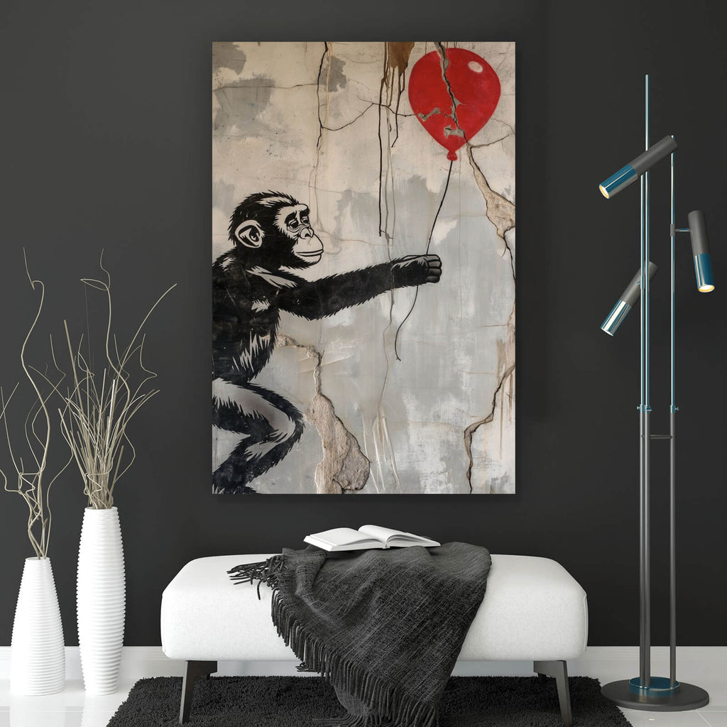 • Lade das Bild in den Galerie-Viewer, Leinwandbild Affe hält roten Ballon Street Art Hochformat