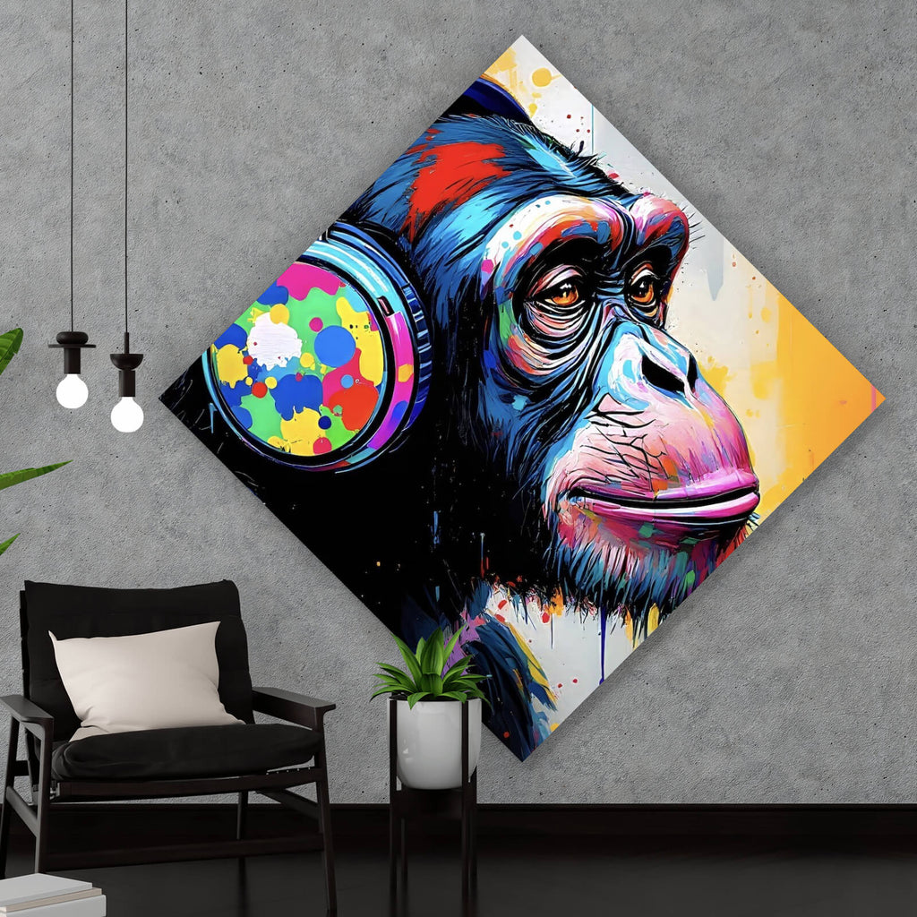Auf der Suche nach einem ausgefallenen Wandbild als Leinwandbild? Das Motiv Affe mit Kopfhörer Graffiti als Raute gefällt dir und du hast nach Wandbildern mit den Wörtern Affe, Kopfhörer, Musik und Tier gesucht? Dann ist dieses Leinwandbild in der Farbe Bunt genau das richtige Wandbild und Dekorelement für dich! Setze ein Highlight an deiner Wand! Das Leinwandbild Affe mit Kopfhörer Graffiti ist in 4 verschiedenen Größen verfügbar, von klein und dezent bis hin zum XXL Leinwandbild.