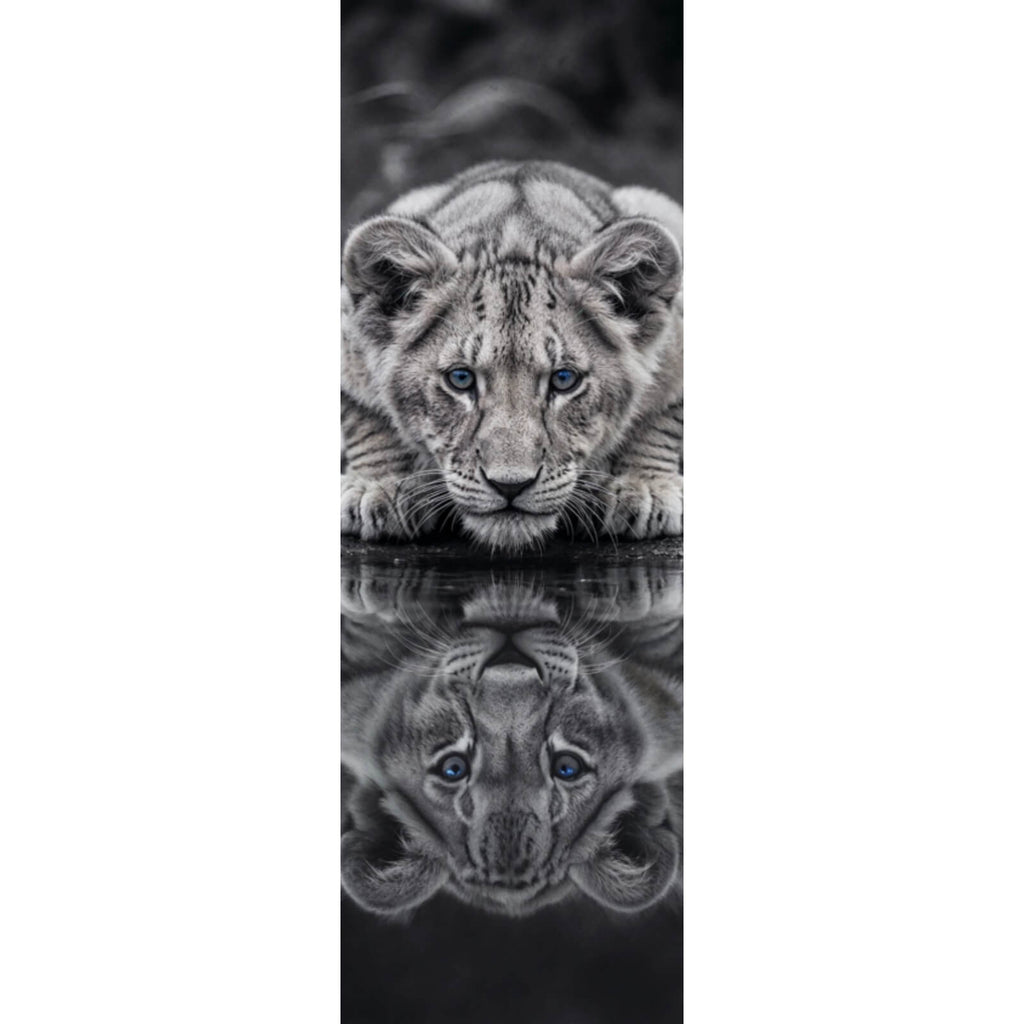 Das eindrucksvolle Wandbild zeigt ein Löwenjunges, das sich über einen spiegelglatten Wasseroberfläche beugt und sein eigenes Spiegelbild betrachtet. Diese Komposition schafft eine faszinierende Symmetrie und zieht den Betrachter in die Tiefe der Szene hinein. Das Motiv besticht durch seine Detailtreue und die eindrucksvolle Darstellung der Wildnis. Die ruhige, fast meditative Atmosphäre des Bildes vermittelt ein Gefühl von Gelassenheit und natürlicher Schönheit. Der Stil des Bildes ist modern und künstlerisch, was es zu einem idealen Dekorationsstück für zeitgenössische Wohnräume macht. Die präzise Fotografie und die harmonische Balance zwischen Motiv und Hintergrund erzeugen eine visuelle Spannung, die das Bild zu einem echten Blickfang macht. Dieses Kunstwerk eignet sich hervorragend, um in Wohnzimmern, Büros oder Schlafzimmern eine exklusive und inspirierende Atmosphäre zu schaffen. Die Reflexion im Wasser verstärkt die ästhetische Wirkung und lädt den Betrachter dazu ein, über die Verbindung von Natur und Kunst nachzudenken. Ein Muss für Liebhaber moderner Wanddekorationen, die einen Hauch von Wildnis und Eleganz in ihr Zuhause bringen möchten.