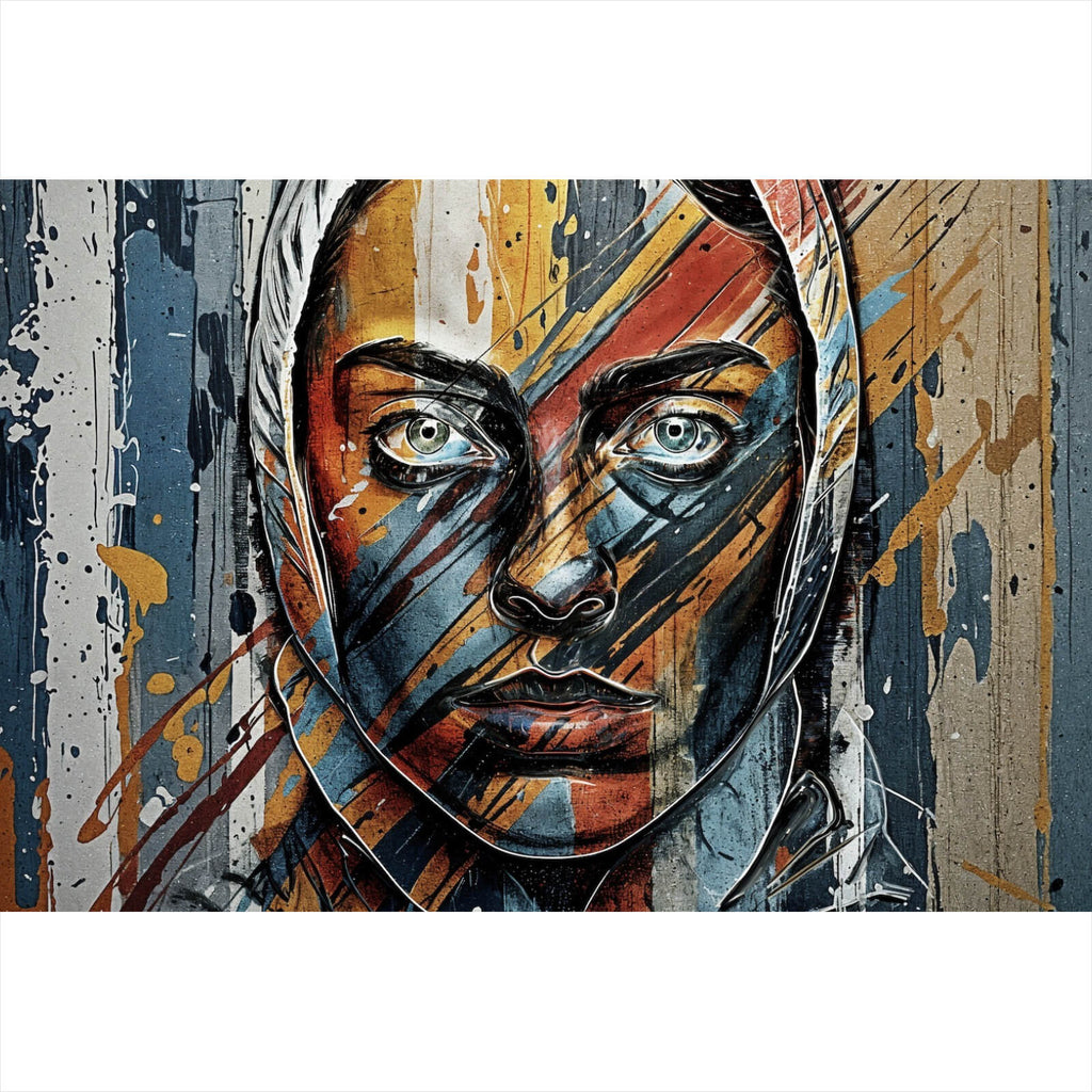 Dieses beeindruckende Wandbild zeigt ein abstraktes Gesicht im modernen Street-Art-Stil, das durch dynamische Linien und kreative Farbverläufe besticht. Die kraftvollen Formen und der künstlerische Ausdruck verleihen dem Bild eine besondere Tiefe und schaffen eine fesselnde Raumwirkung. Das Gesicht wirkt durch die kontrastreichen Elemente lebendig und ausdrucksstark, wodurch es sofort die Aufmerksamkeit auf sich zieht. Die Komposition ist kunstvoll gestaltet, um einen starken visuellen Eindruck zu hinterlassen und gleichzeitig eine moderne, urbane Ästhetik zu verkörpern. Die Kombination von abstrakten und realistischen Elementen verleiht dem Bild eine einzigartige Dynamik, die es ideal für zeitgenössische Räume macht. Die Textur und die Linienführung schaffen eine harmonische Balance zwischen Chaos und Ordnung, was dem Betrachter ein Gefühl von Energie und Kreativität vermittelt. Dieses Kunstwerk ist nicht nur eine Dekoration, sondern ein echtes Statement-Stück, das in einer Galerie ebenso gut zur Geltung kommt wie in einem stilvollen Wohnzimmer oder einem kreativen Büroraum. Es ist perfekt, um eine inspirierende und moderne Atmosphäre zu schaffen und jedem Raum eine besondere Note zu verleihen.