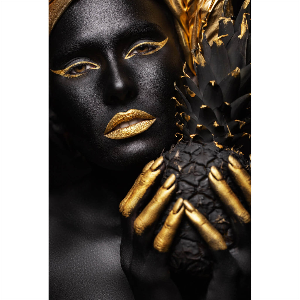 Auf der Suche nach einem ausgefallenen Wandbild als Leinwandbild? Das Motiv Frauenportrait Schwarz mit Gold im Hochformat gefällt dir und du hast nach Wandbildern mit den Wörtern Frau, Portrait, Bodypaint, Lippen, Ananas, Make Up, Beauty, Frucht, Schönheit, Sexy, Gold und Gesicht gesucht? Dann ist dieses Leinwandbild in den Farben Schwarz und Gold genau das richtige Wandbild und Dekorelement für dich! Setze ein Highlight an deiner Wand! Das Leinwandbild Frauenportrait Schwarz mit Gold ist in 5 verschiedenen Größen verfügbar, von klein und dezent bis hin zum XXL Leinwandbild.