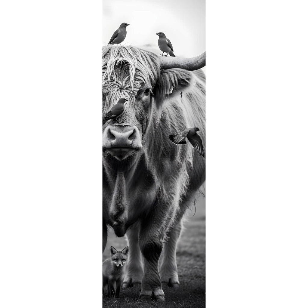 Das Wandbild zeigt ein majestätisches Hochlandrind, das mit seiner imposanten Präsenz im Mittelpunkt steht. Auf seinen geschwungenen Hörnern sitzen mehrere Vögel, was dem Bild eine faszinierende Symbiose von Tierarten verleiht. Unterhalb des Rinds schaut ein neugieriger Fuchs hervor, der dem Bild eine zusätzliche Dynamik und einen Hauch von Wildheit verleiht. Die gesamte Szene strahlt eine ruhige, fast meditative Atmosphäre aus, die perfekt für eine entspannende Raumgestaltung geeignet ist. Das Hochlandrind, bekannt für seine robuste Natur und seine lange, zottelige Fellstruktur, verleiht dem Bild eine eindrucksvolle Tiefe und Textur. Die Anordnung der Tiere und der Detailreichtum in der Darstellung machen das Bild zu einem echten Hingucker, der sowohl in modernen als auch in klassischen Interieur-Stilen hervorragend zur Geltung kommt. Die Verwendung von Schwarz-Weiß-Tönen unterstreicht die natürliche Eleganz und zeitlose Schönheit des Motivs. Ideal für Naturliebhaber und alle, die ihrem Zuhause oder Büro eine besondere Note verleihen möchten, wirkt dieses Wandbild beruhigend und inspirierend zugleich und schafft eine harmonische Verbindung zur Natur.