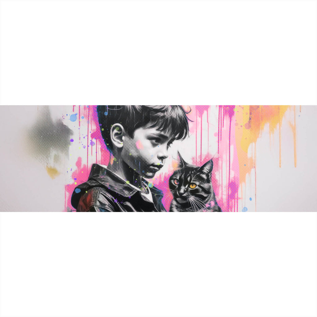 Das Bild zeigt ein ausdrucksstarkes Graffiti-Kunstwerk, das einen jungen Jungen darstellt, der liebevoll eine Katze hält. Die Szenerie ist in einem urbanen, modernen Stil gehalten, der durch lebendige Sprühfarben zum Leben erweckt wird. Der Hintergrund ist eine Explosion aus Farben, hauptsächlich in Pink, Gelb und Blau, die in dynamischen Tropfen und Spritzern gestaltet sind. Diese bunten Akzente kontrastieren stark mit dem schwarz-grauen Portrait des Jungen und der Katze, wodurch ein beeindruckender visueller Effekt entsteht. Die Worte "You're just purrrfect" sind in kräftigen gelben und pinken Buchstaben geschrieben und verleihen dem Bild eine spielerische Note. Der Junge trägt eine Jacke, und sein Blick ist liebevoll auf die Katze gerichtet, die aufmerksam in die Ferne schaut. Diese Darstellung fängt die Essenz von Freundschaft und Zuneigung ein und kombiniert sie mit einer künstlerischen, urbanen Ästhetik, die sowohl modern als auch zeitlos wirkt. Das Zusammenspiel von Farben und der lebendige Ausdruck der Figuren machen dieses Bild zu einem bemerkenswerten Beispiel für zeitgenössische Street Art.