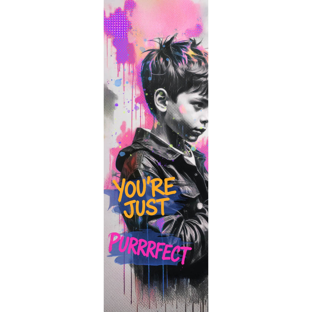 Das Bild zeigt ein ausdrucksstarkes Graffiti-Kunstwerk, das einen jungen Jungen darstellt, der liebevoll eine Katze hält. Die Szenerie ist in einem urbanen, modernen Stil gehalten, der durch lebendige Sprühfarben zum Leben erweckt wird. Der Hintergrund ist eine Explosion aus Farben, hauptsächlich in Pink, Gelb und Blau, die in dynamischen Tropfen und Spritzern gestaltet sind. Diese bunten Akzente kontrastieren stark mit dem schwarz-grauen Portrait des Jungen und der Katze, wodurch ein beeindruckender visueller Effekt entsteht. Die Worte "You're just purrrfect" sind in kräftigen gelben und pinken Buchstaben geschrieben und verleihen dem Bild eine spielerische Note. Der Junge trägt eine Jacke, und sein Blick ist liebevoll auf die Katze gerichtet, die aufmerksam in die Ferne schaut. Diese Darstellung fängt die Essenz von Freundschaft und Zuneigung ein und kombiniert sie mit einer künstlerischen, urbanen Ästhetik, die sowohl modern als auch zeitlos wirkt. Das Zusammenspiel von Farben und der lebendige Ausdruck der Figuren machen dieses Bild zu einem bemerkenswerten Beispiel für zeitgenössische Street Art.