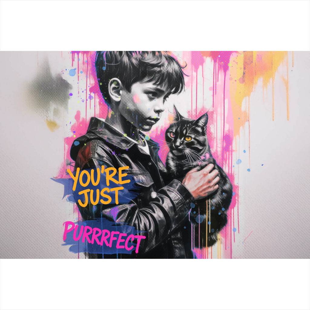 Das Bild zeigt ein ausdrucksstarkes Graffiti-Kunstwerk, das einen jungen Jungen darstellt, der liebevoll eine Katze hält. Die Szenerie ist in einem urbanen, modernen Stil gehalten, der durch lebendige Sprühfarben zum Leben erweckt wird. Der Hintergrund ist eine Explosion aus Farben, hauptsächlich in Pink, Gelb und Blau, die in dynamischen Tropfen und Spritzern gestaltet sind. Diese bunten Akzente kontrastieren stark mit dem schwarz-grauen Portrait des Jungen und der Katze, wodurch ein beeindruckender visueller Effekt entsteht. Die Worte "You're just purrrfect" sind in kräftigen gelben und pinken Buchstaben geschrieben und verleihen dem Bild eine spielerische Note. Der Junge trägt eine Jacke, und sein Blick ist liebevoll auf die Katze gerichtet, die aufmerksam in die Ferne schaut. Diese Darstellung fängt die Essenz von Freundschaft und Zuneigung ein und kombiniert sie mit einer künstlerischen, urbanen Ästhetik, die sowohl modern als auch zeitlos wirkt. Das Zusammenspiel von Farben und der lebendige Ausdruck der Figuren machen dieses Bild zu einem bemerkenswerten Beispiel für zeitgenössische Street Art.