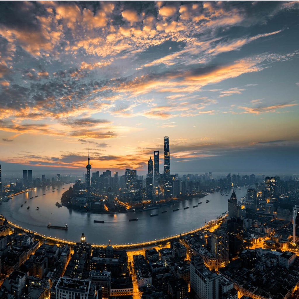 Das Bild zeigt eine beeindruckende moderne Stadtlandschaft, die durch ihre imposante Skyline und das weite Panorama besticht. Die dynamische Anordnung der Hochhäuser und Wolkenkratzer schafft eine beeindruckende Silhouette am Horizont. Diese städtische Metropole präsentiert sich in voller Pracht, wobei die Beleuchtung der Gebäude bei Dämmerung ein faszinierendes Spiel von Licht und Schatten erzeugt. Die Perspektive aus der Vogelperspektive verleiht dem Betrachter das Gefühl, über die Stadt zu schweben, und eröffnet eine umfassende Aussicht auf die urbane Dynamik. Der Fluss, der sich durch die Stadt schlängelt, fügt eine natürliche Komponente hinzu und betont die harmonische Verbindung von Natur und Architektur. Die Konturen der Stadt zeichnen sich klar gegen den Horizont ab, unterstrichen von der subtilen Beleuchtung, die die architektonischen Details hervorhebt. Diese Darstellung einer modernen Metropole ist ideal für Liebhaber von Urbanität und Architektur, die die Energie und das Leben der Stadt in ihren Wohn- oder Arbeitsräumen integrieren möchten. Das Bild vermittelt eine Stimmung von Fortschritt und Innovation, während es gleichzeitig eine beruhigende Atmosphäre durch die weite Perspektive und die harmonische Anordnung der Elemente schafft.