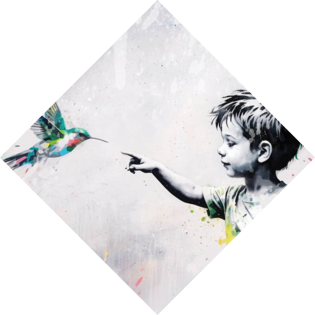 Auf der Suche nach einem ausgefallenen Wandbild als Leinwandbild? Das Motiv Kind berührt Vögel als Raute gefällt dir und du hast nach Wandbildern mit den Wörtern Kind, Kindheit, Kolibri, Vögel, Anziehung, Kreativ, Atmosphäre, Inspiration, Dynamik, Ausdruck, Lebhaft und Pop Art gesucht? Dann ist dieses Leinwandbild in der Farbe Bunt genau das richtige Wandbild und Dekorelement für dich! Setze ein Highlight an deiner Wand! Das Leinwandbild Kind berührt Vögel ist in 4 verschiedenen Größen verfügbar, von klein und dezent bis hin zum XXL Leinwandbild.