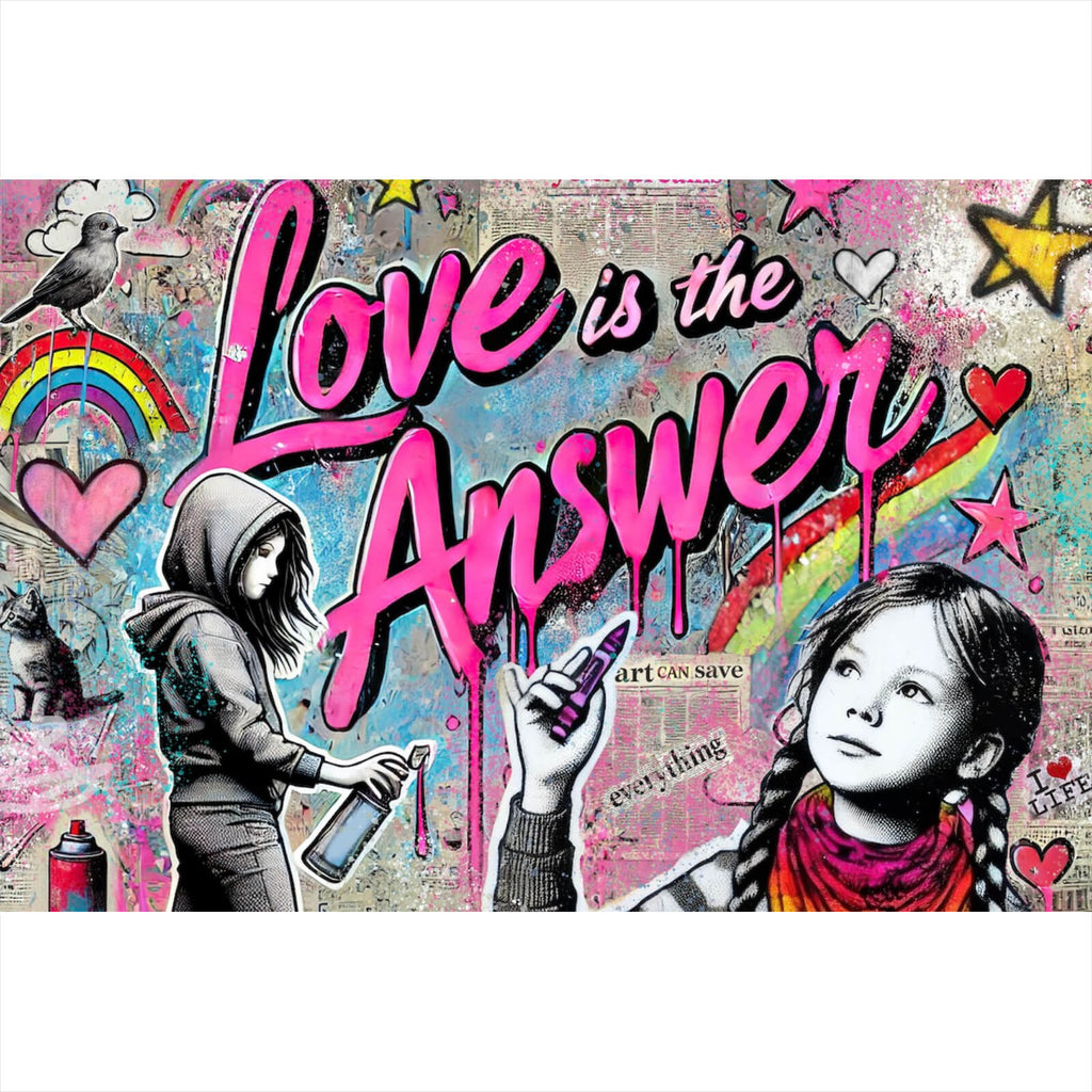 Dieses beeindruckende Wandbild vereint moderne Graffiti-Kunst mit einer inspirierenden Botschaft, die sofort ins Auge fällt: "Love is the Answer". Im Vordergrund stehen zwei Figuren, ein Mädchen mit Zöpfen, das einen Stift in der Hand hält und künstlerisch tätig ist, sowie eine weitere Person, die eine Sprühdose nutzt. Diese Darstellung verkörpert Kreativität und Ausdruckskraft, während sie gleichzeitig an die Bedeutung von Liebe und positive Gedanken erinnert. Die Verwendung von dynamischen Formen und urbanen Elementen verleiht dem Bild eine besondere Tiefe und schafft eine lebendige Raumwirkung. Die Kombination von Schriftzügen und visuellen Symbolen in Pop-Art-Stil sorgt für eine starke visuelle Anziehungskraft. Das Bild eignet sich hervorragend als dekoratives Element in modernen Wohnräumen, Büros oder Kinderzimmern, wo es als tägliche Erinnerung an die Kraft der Liebe und Kreativität dient. Der Stil des Bildes erinnert an Streetart, was ihm einen authentischen und urbanen Charakter verleiht, der in verschiedenen Raumgestaltungen einen markanten Akzent setzen kann. Die Materialanmutung des Bildes vermittelt eine Mischung aus künstlerischer Freiheit und stilistischer Präzision, was es zu einem idealen Kunstwerk für Liebhaber moderner und ausdrucksstarker Dekoration macht.