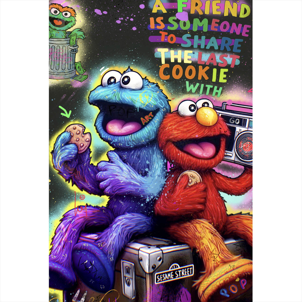 Das Bild zeigt eine lebendige, farbenfrohe Illustration, die zwei ikonische Figuren darstellt. Der blaue Charakter hält einen Keks in der Hand und hat ein fröhliches Lächeln im Gesicht. Neben ihm sitzt der rote Charakter, der ebenfalls einen Keks genießt und ein großes, altes Radio hält. Beide Figuren sitzen auf einer Kiste, die mit der Aufschrift "Sesame Street" versehen ist. Diese Szene strahlt eine warme, fröhliche Atmosphäre aus und vermittelt ein Gefühl von Gemeinschaft und Freundschaft. Im Hintergrund ist ein grüner Charakter zu sehen, der aus einem Mülleimer hervorlugt, um die Szene zu beobachten. Die Umgebung ist mit leuchtenden Farben und Spritzern gestaltet, was dem Ganzen einen dynamischen, pop-artigen Stil verleiht. Der Schriftzug „A friend is someone to share the last cookie with“ ergänzt die Szene perfekt, indem er die Bedeutung der Freundschaft unterstreicht. Die Mischung aus Graffiti-Elementen und leuchtenden Farben gibt dem Bild eine einzigartige, kreative Note, die sowohl Kinder als auch Erwachsene anspricht.